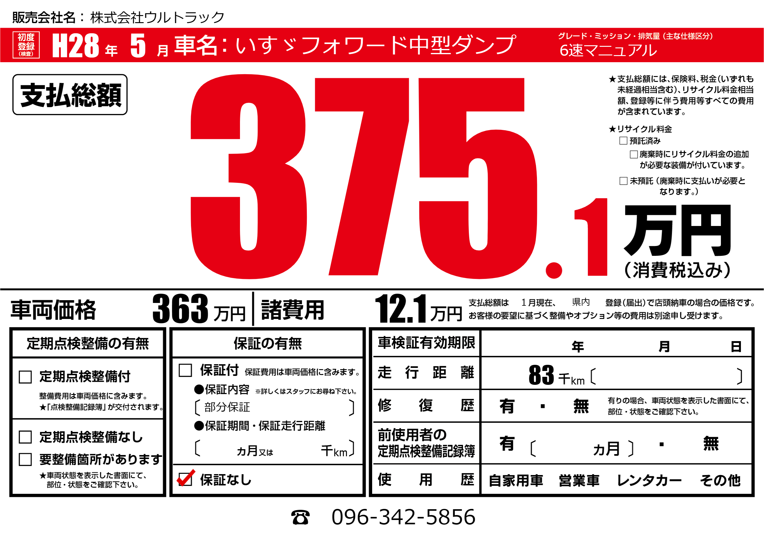 | 車名 | いすゞフォワード中型ダンプ | グレード ミッション 排気量 |