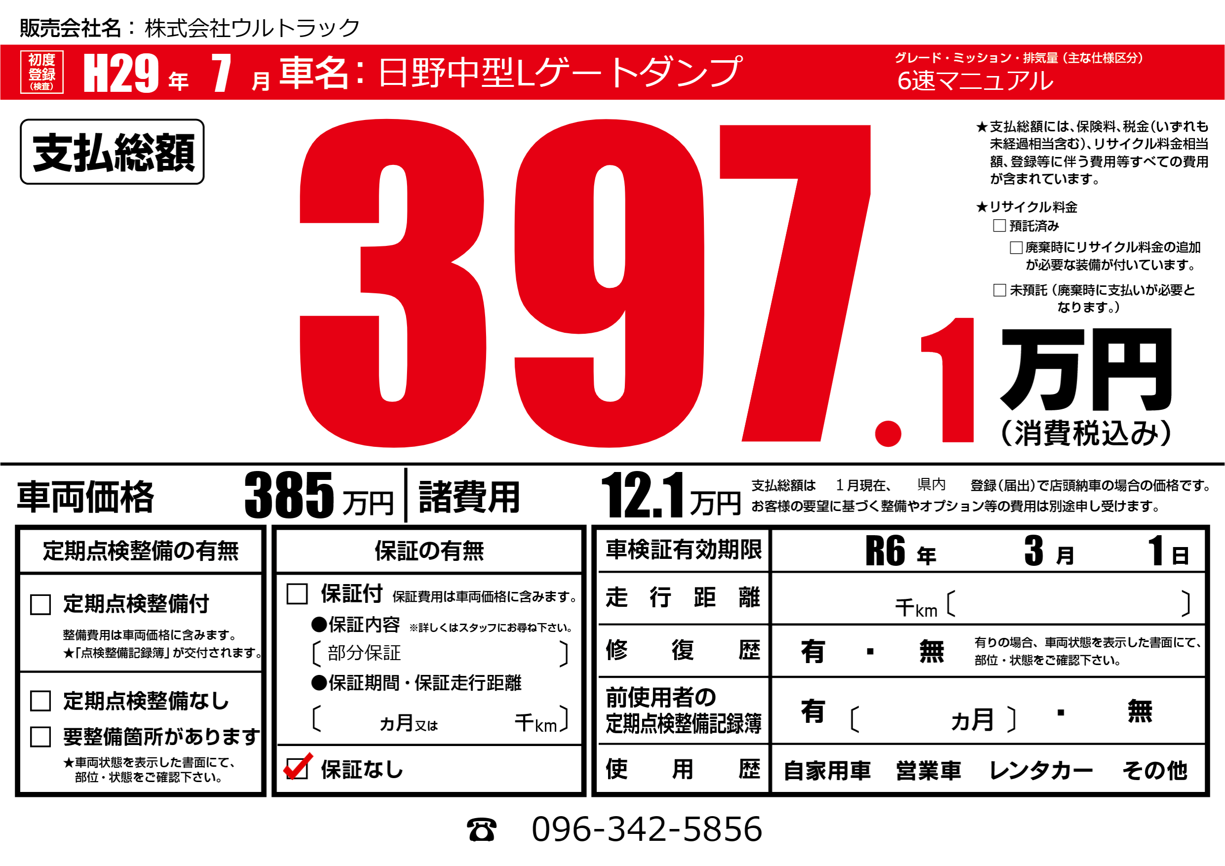 | 車名 | 日野中型Lゲートダンプ | グレード ミッション 排気量 |