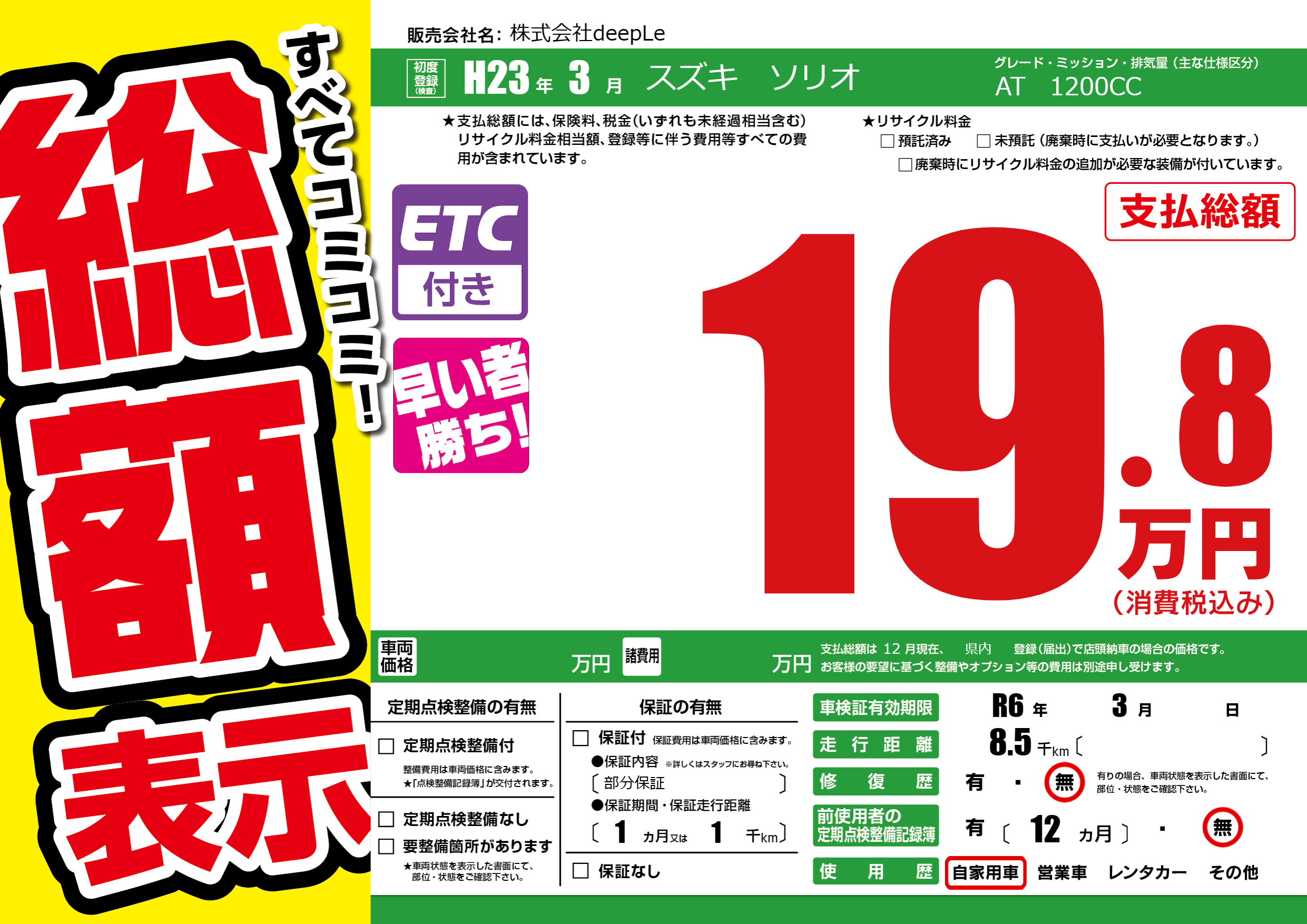 | 走行キロ | 0.8万km | 初年度登録 | H23年3月 |
