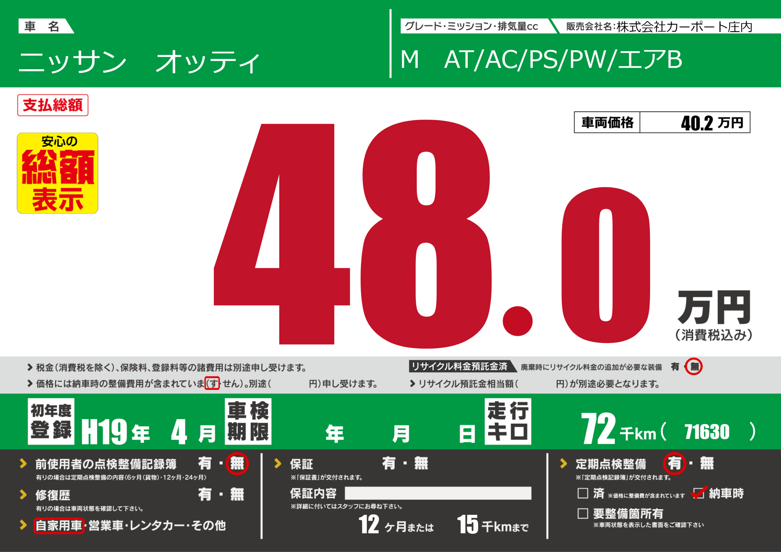 | 車名 | ニッサン オッティ | グレード ミッション 排気量 |