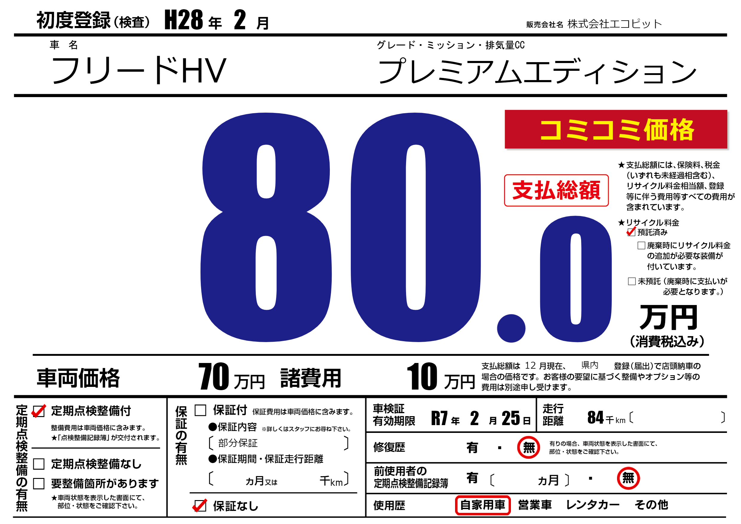 | 車名 | フリードHV | グレード ミッション 排気量 |