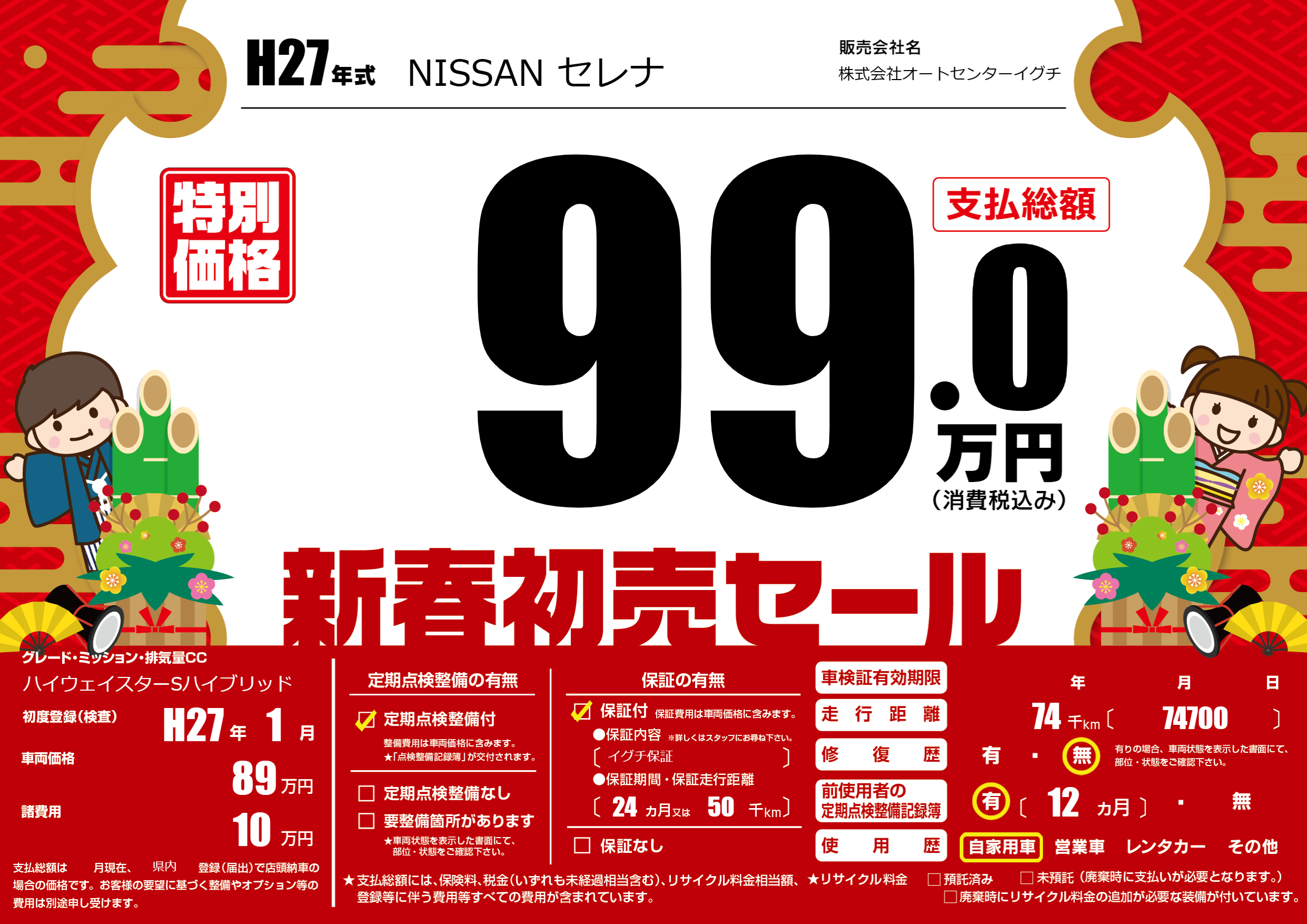 | 車名 | NISSAN セレナ | グレード ミッション 排気量 |