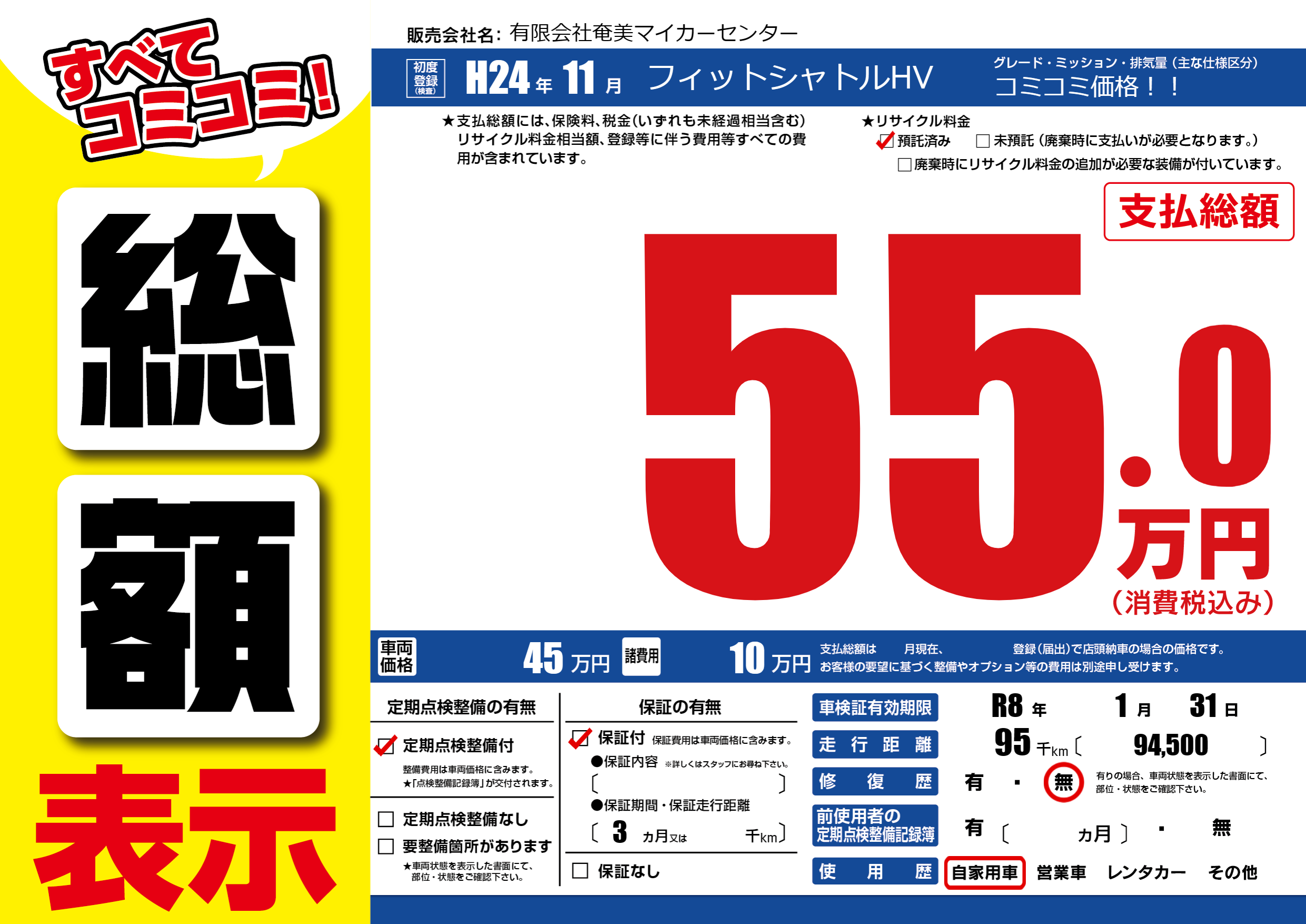 | 走行キロ | 9.5万km | 初年度登録 | H24年11月 |