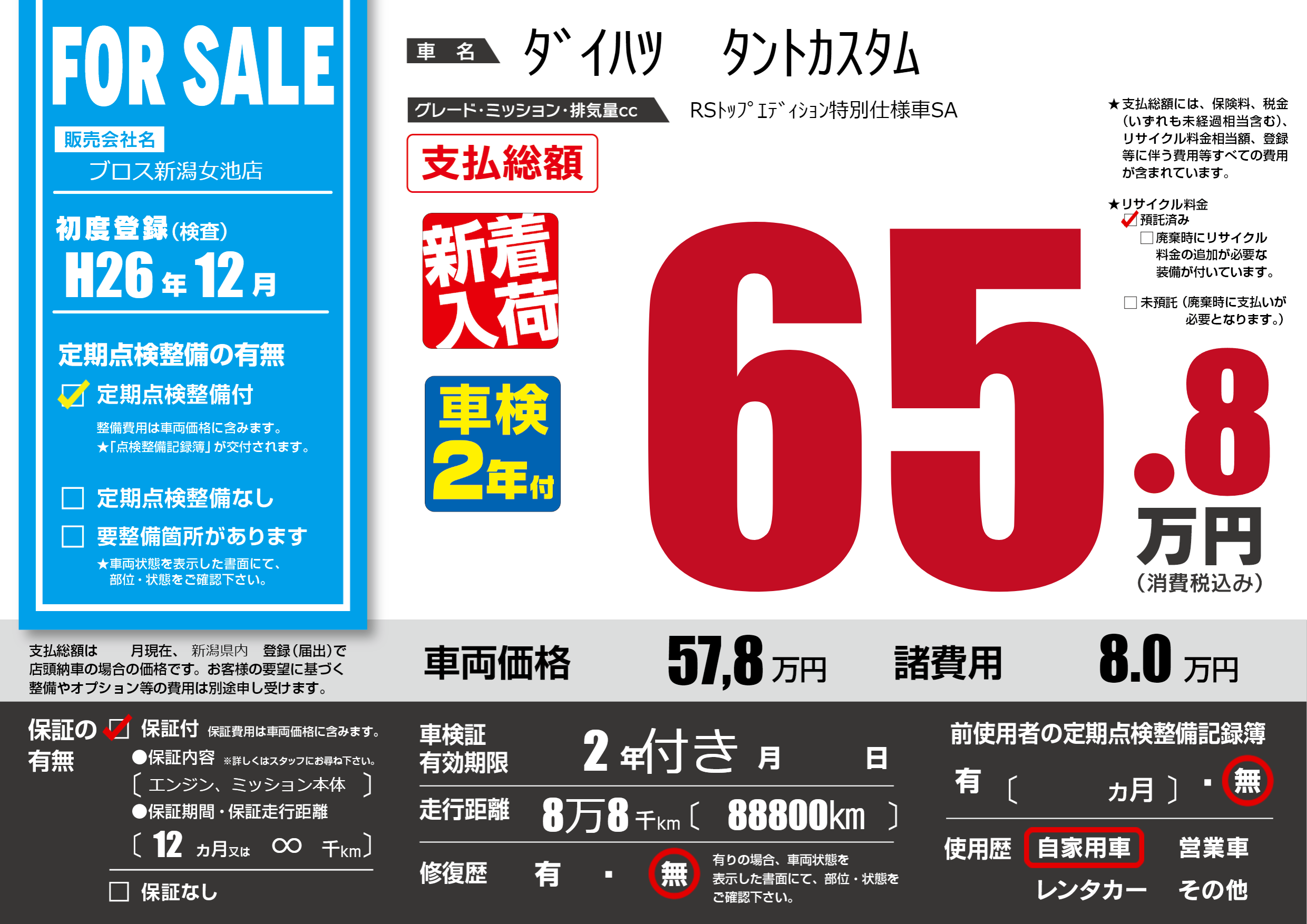 | 走行キロ | 0.8万km | 初年度登録 | H26年12月 |