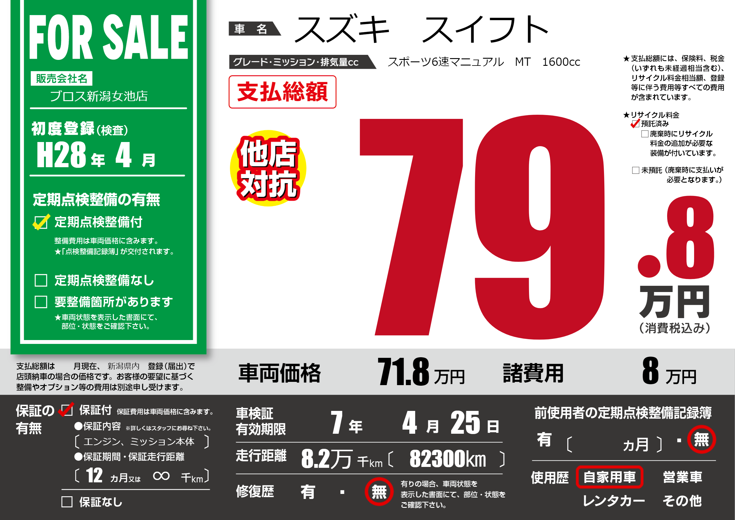 | 車名 | スズキ スイフト | グレード ミッション 排気量 |