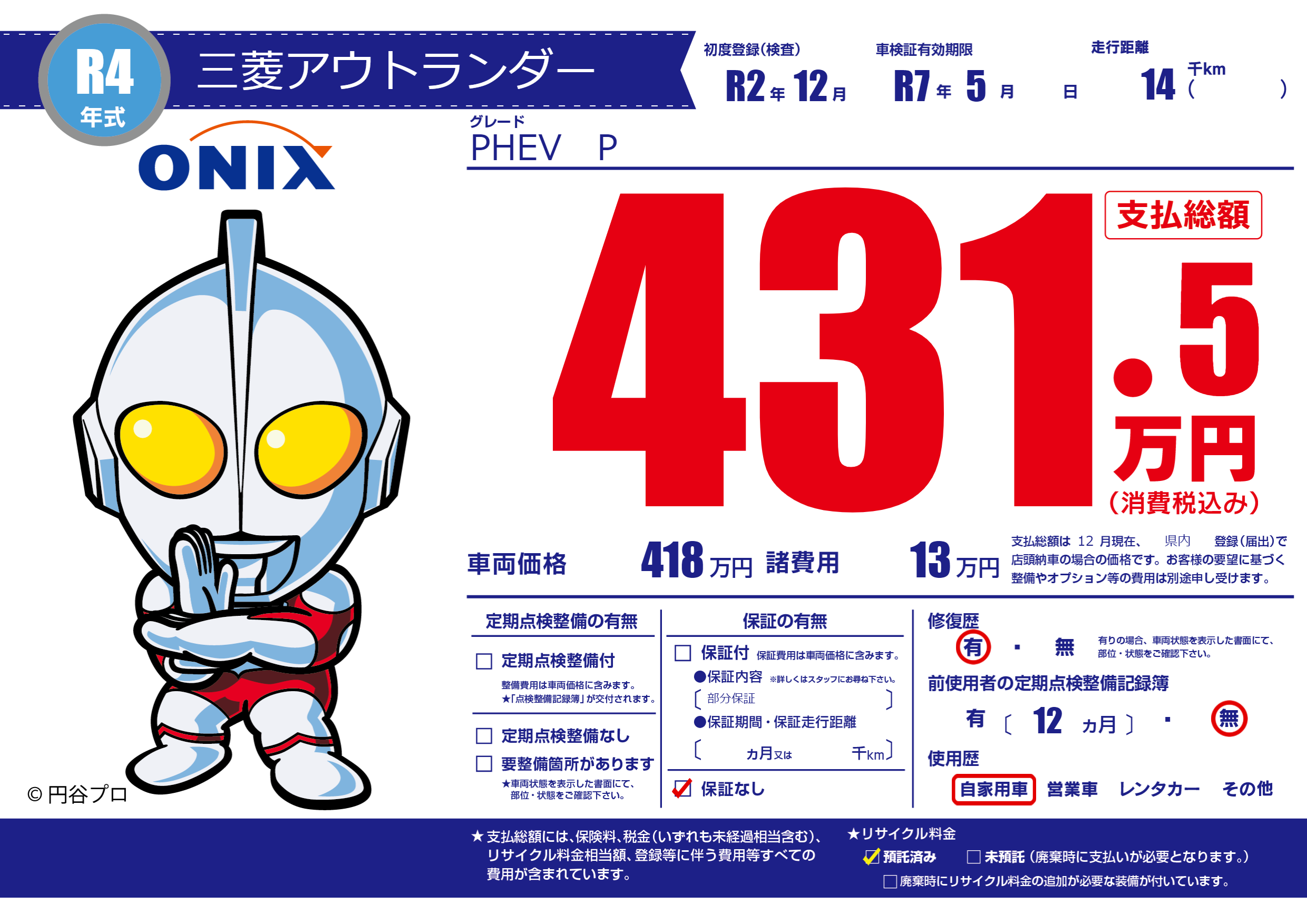 | 車名 | 三菱アウトランダー | グレード ミッション 排気量 |
