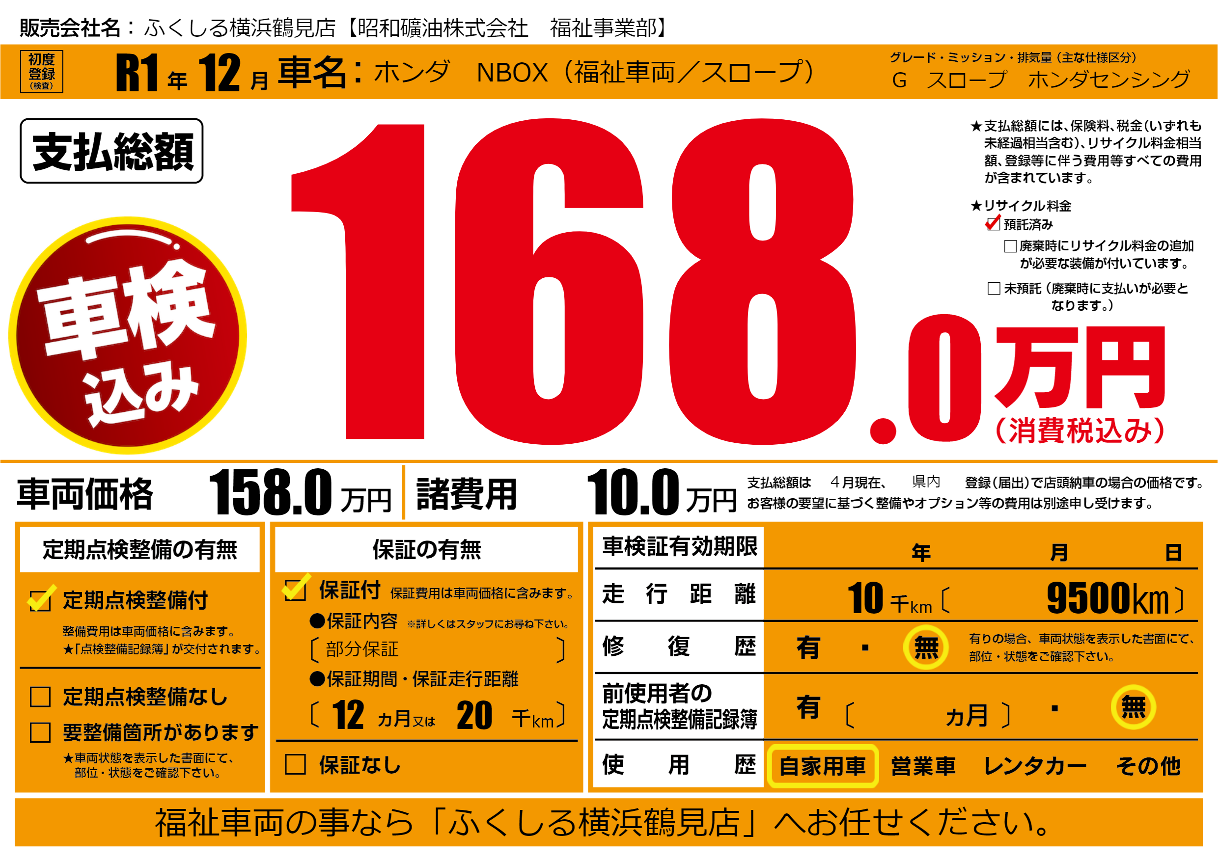 | 車名 | ホンダ NBOX(福祉車両/スロープ) | グレード ミッション 排気量 |