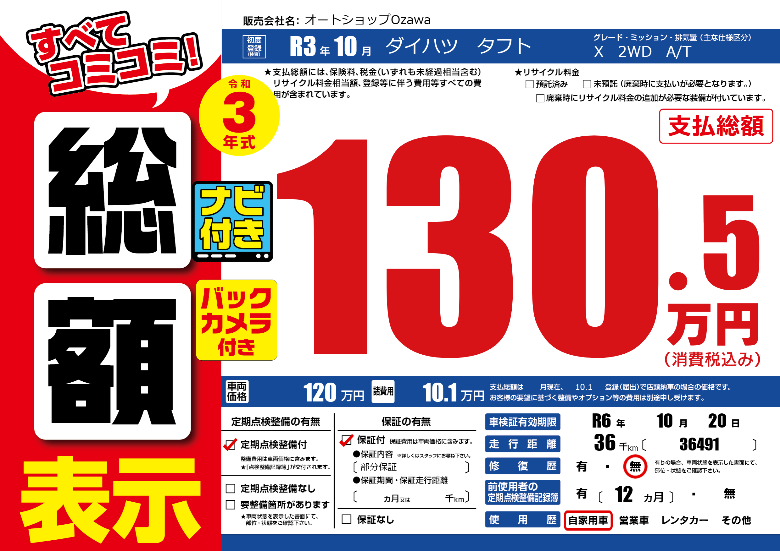 | 車名 | ダイハツ タフト | グレード ミッション 排気量 |