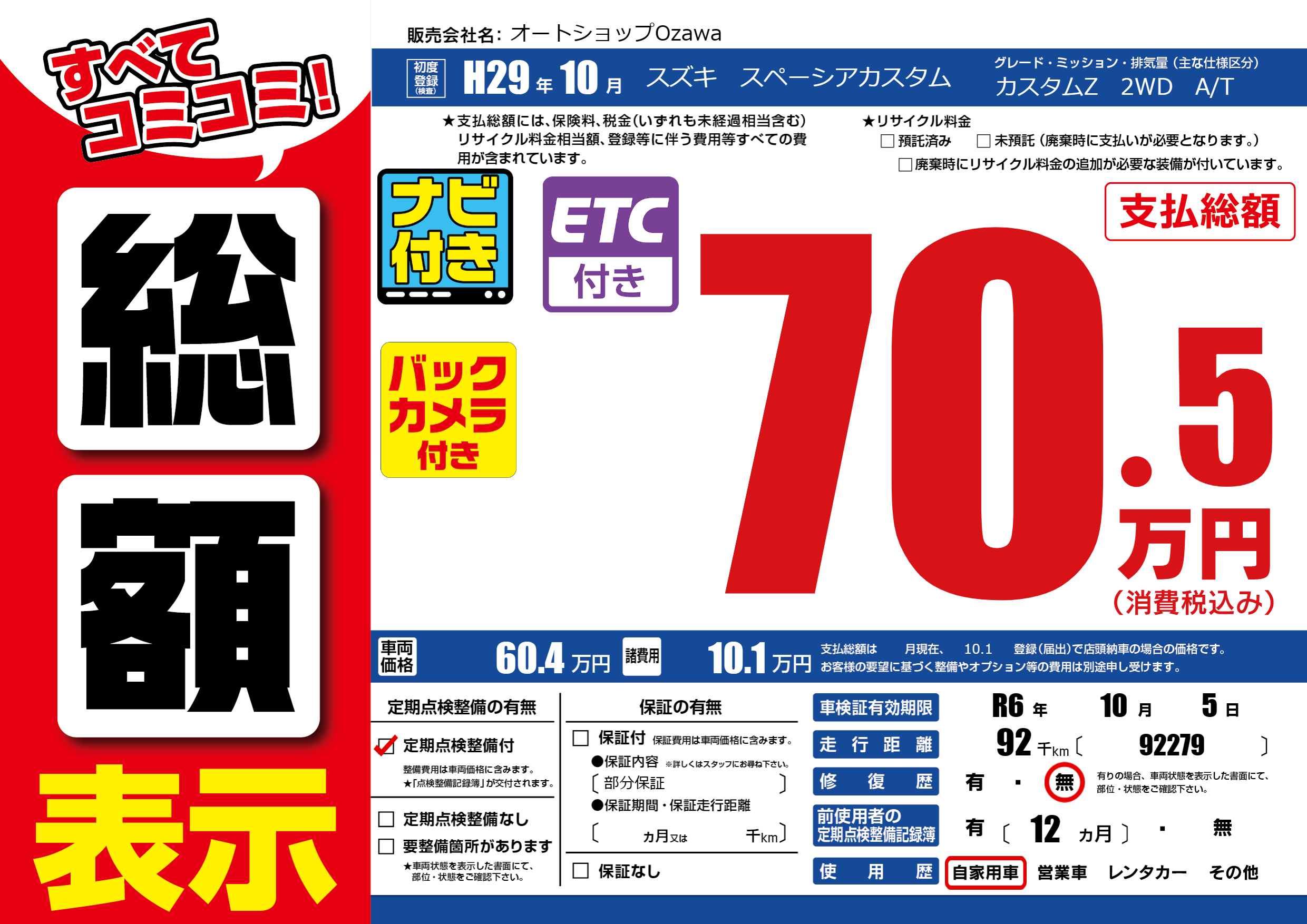 | 車名 | スズキ スペーシアカスタム | グレード ミッション 排気量 |