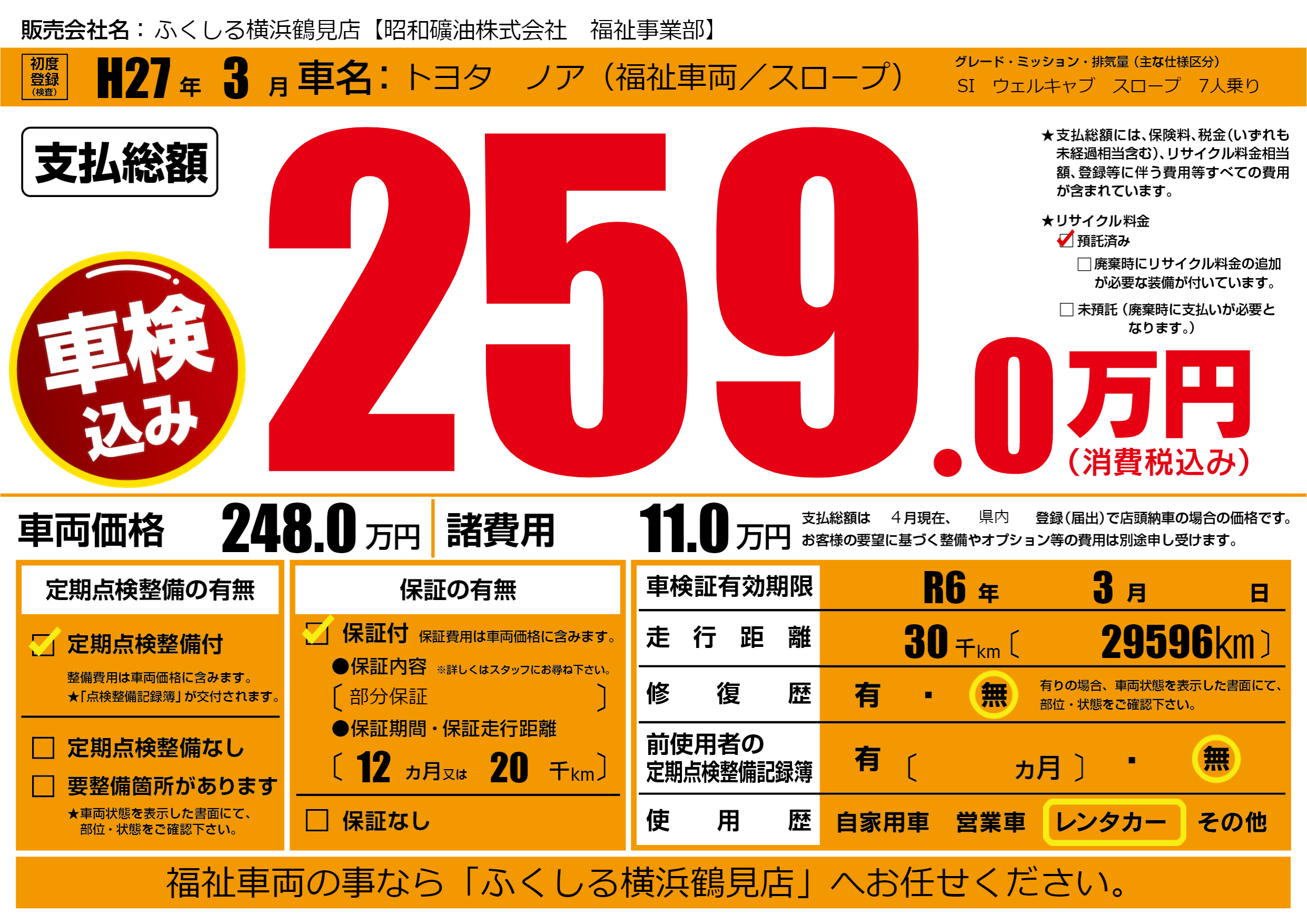| 車名 | トヨタ ノア(福祉車両/スロープ) | グレード ミッション 排気量 |