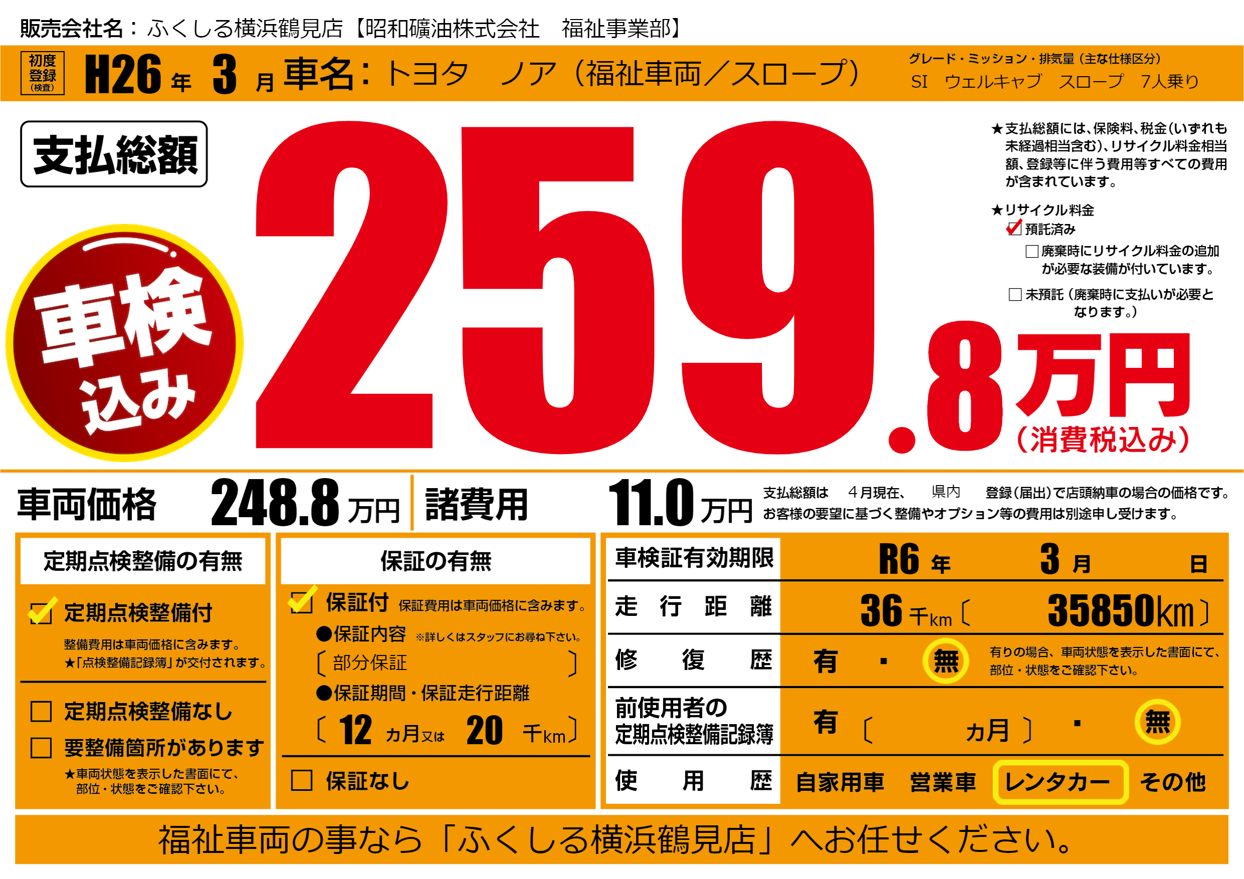 | 車名 | トヨタ ノア(福祉車両/スロープ) | グレード ミッション 排気量 |