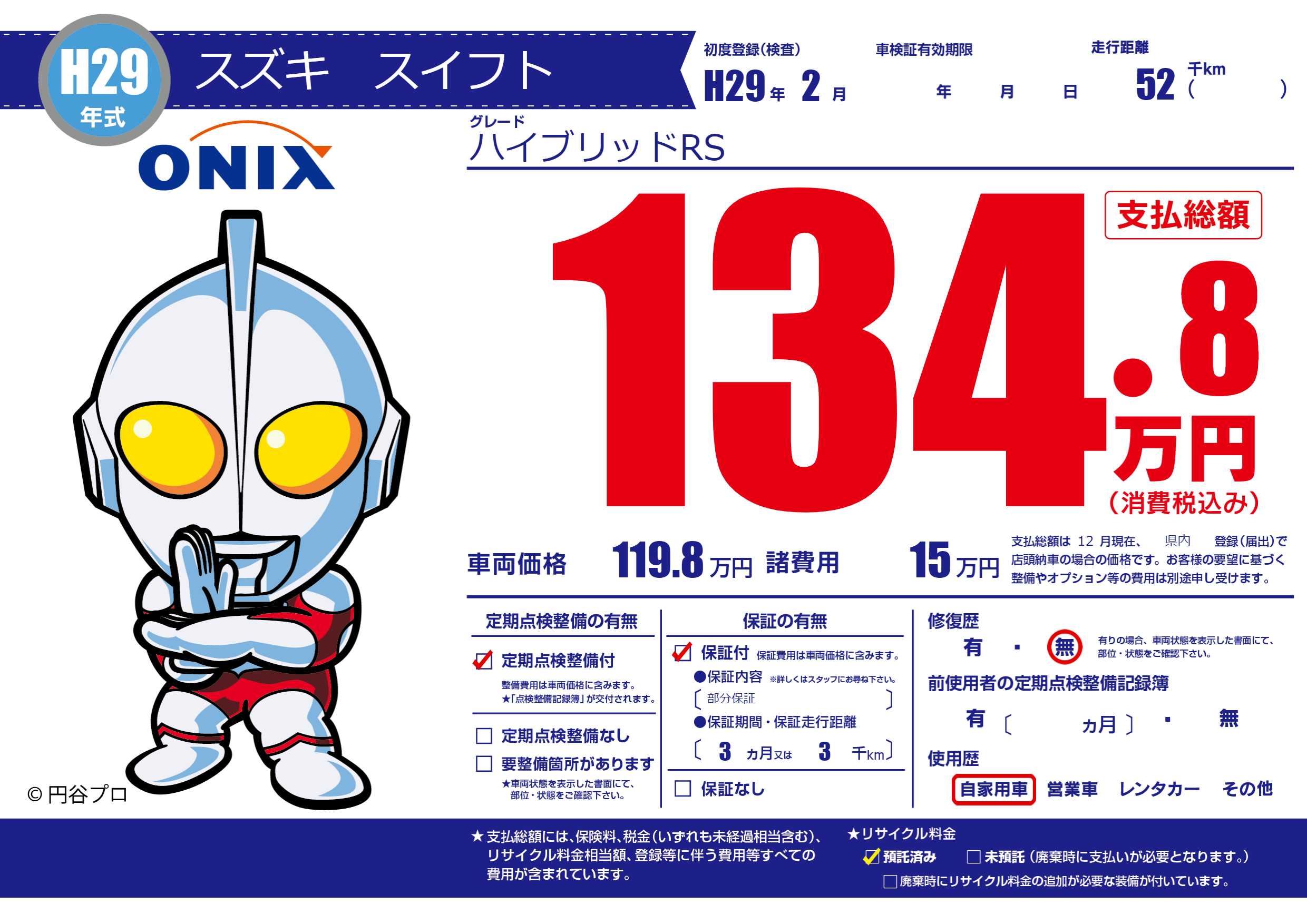 | 走行キロ | 5.2万km | 初年度登録 | H29年2月 |