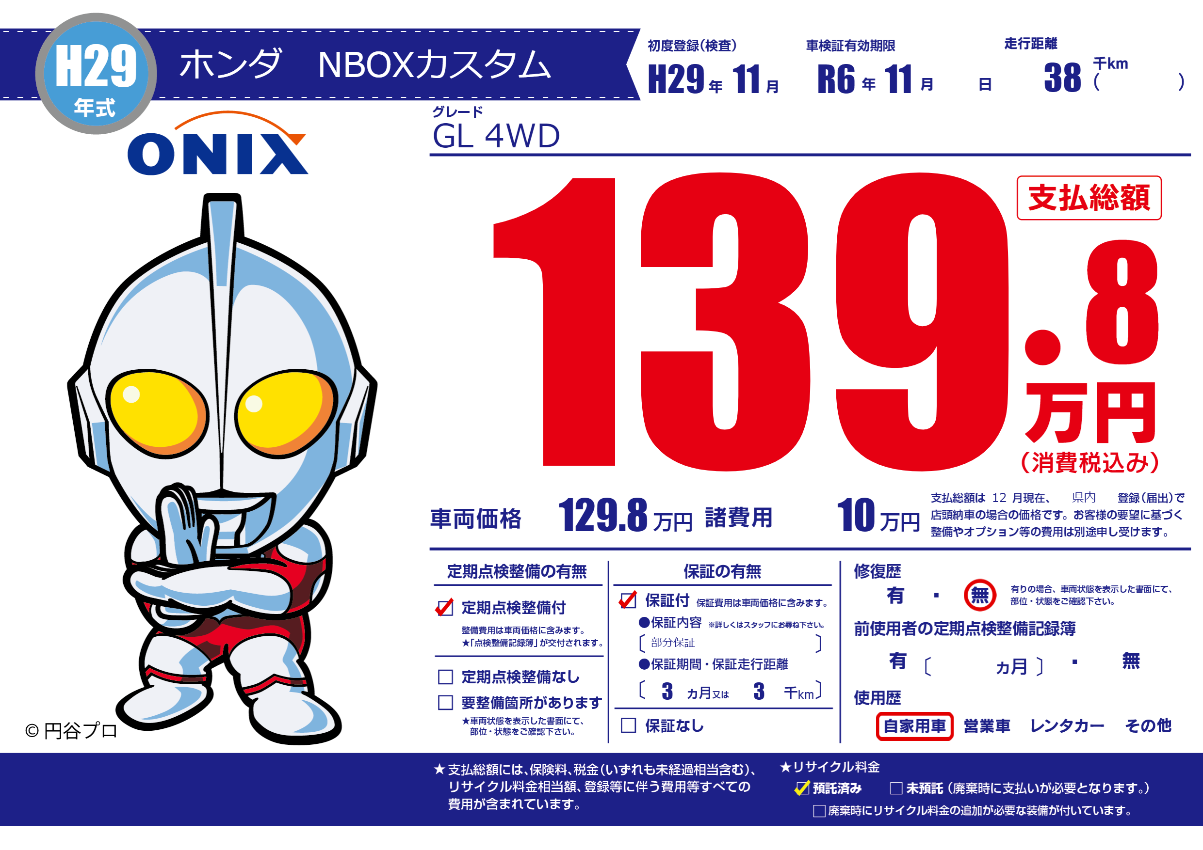 | 走行キロ | 3.8万km | 初年度登録 | H29年11月 |