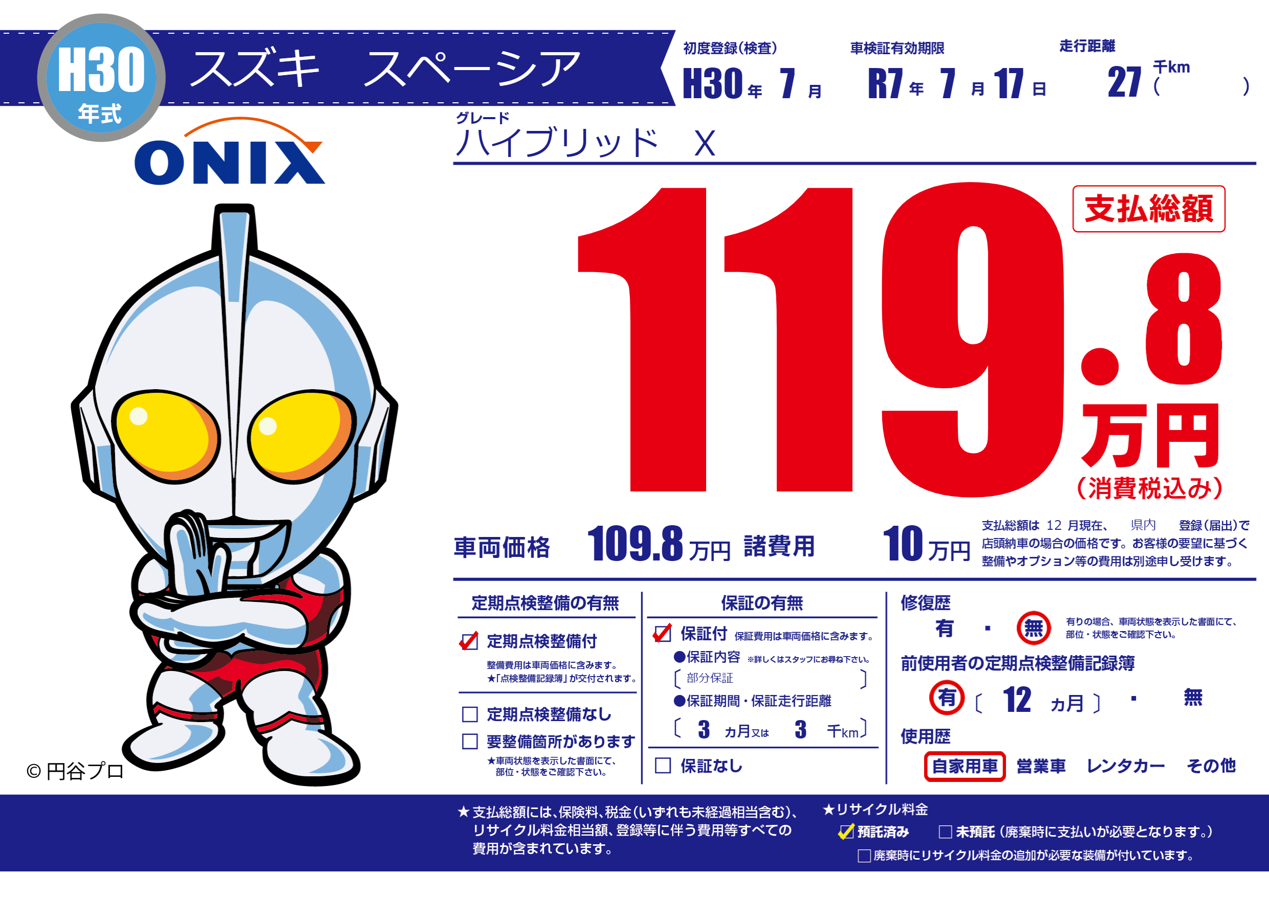 | 走行キロ | 2.7万km | 初年度登録 | H30年7月 |