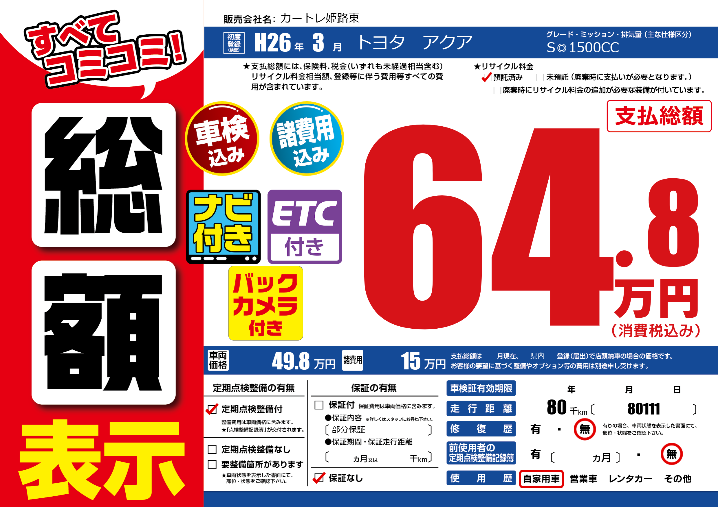 | 走行キロ | 8万km | 初年度登録 | H26年3月 |