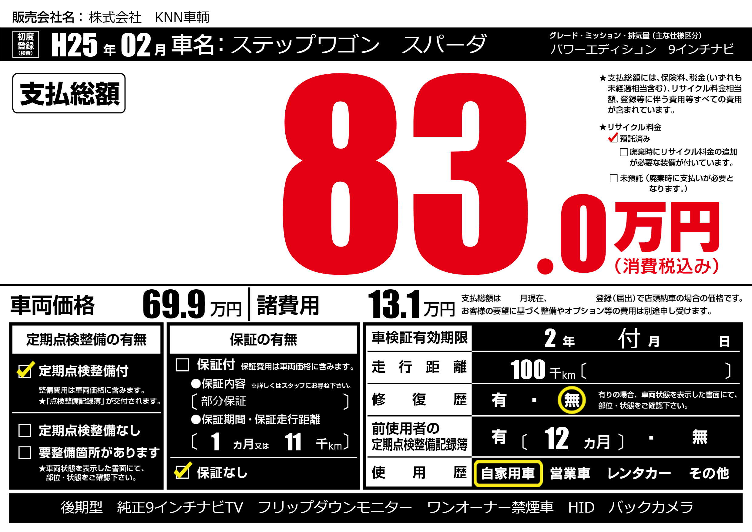 | 走行キロ | 10万km | 初年度登録 | H25年02月 |