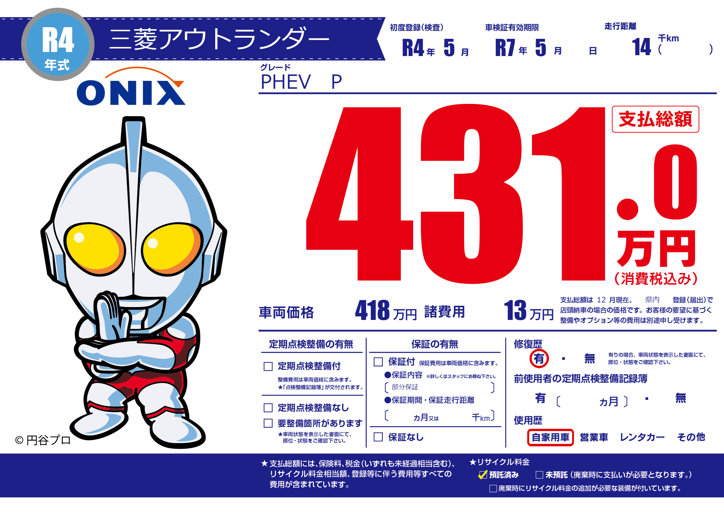 | 車名 | 三菱アウトランダー | グレード ミッション 排気量 |