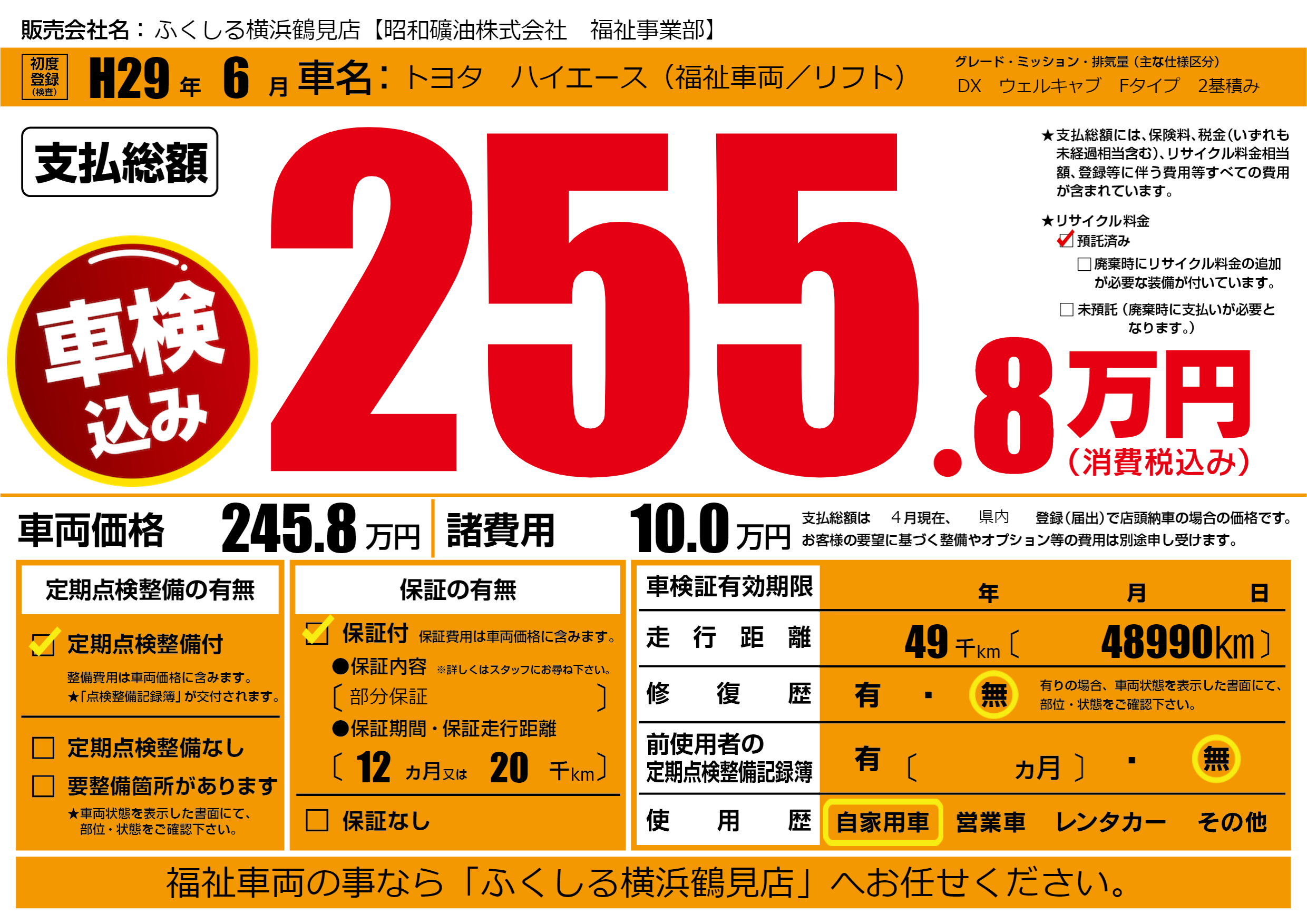 | 車名 | トヨタ ハイエース(福祉車両/リフト) | グレード ミッション 排気量 |