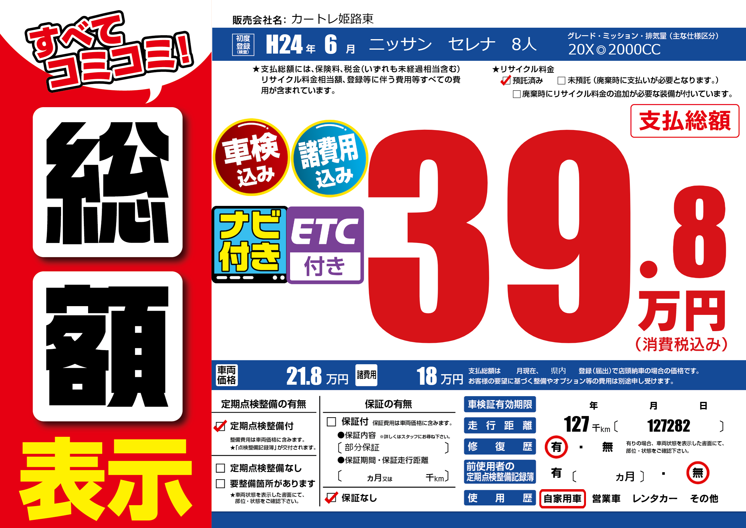 | 走行キロ | 12.7万km | 初年度登録 | H24年6月 |