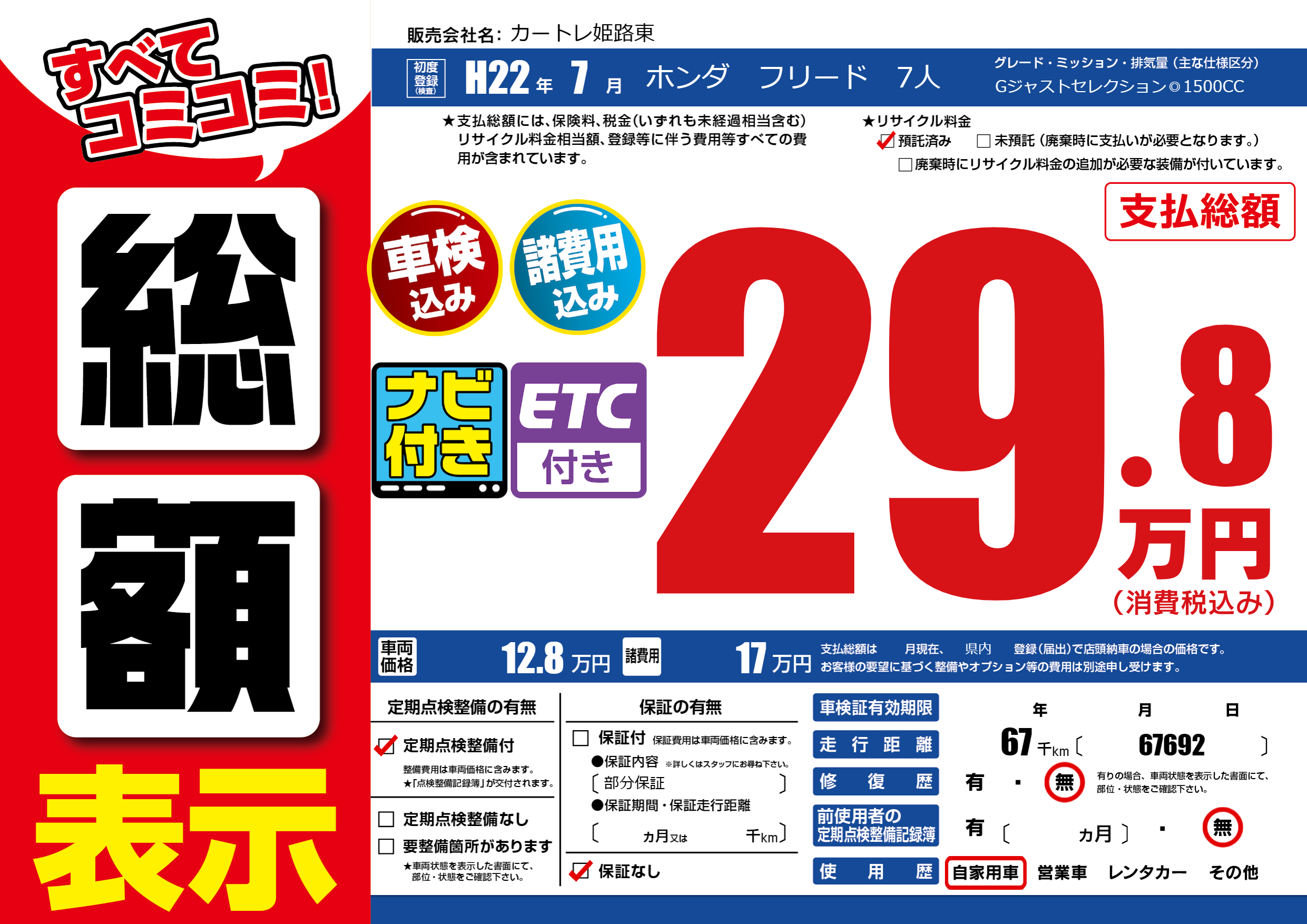 | 車名 | ホンダ フリード 7人 | グレード ミッション 排気量 |