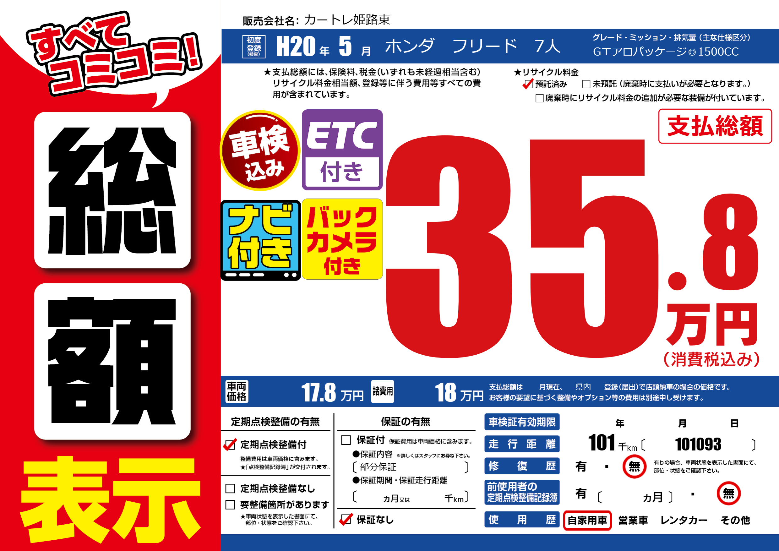 | 車名 | ホンダ フリード 7人 | グレード ミッション 排気量 |