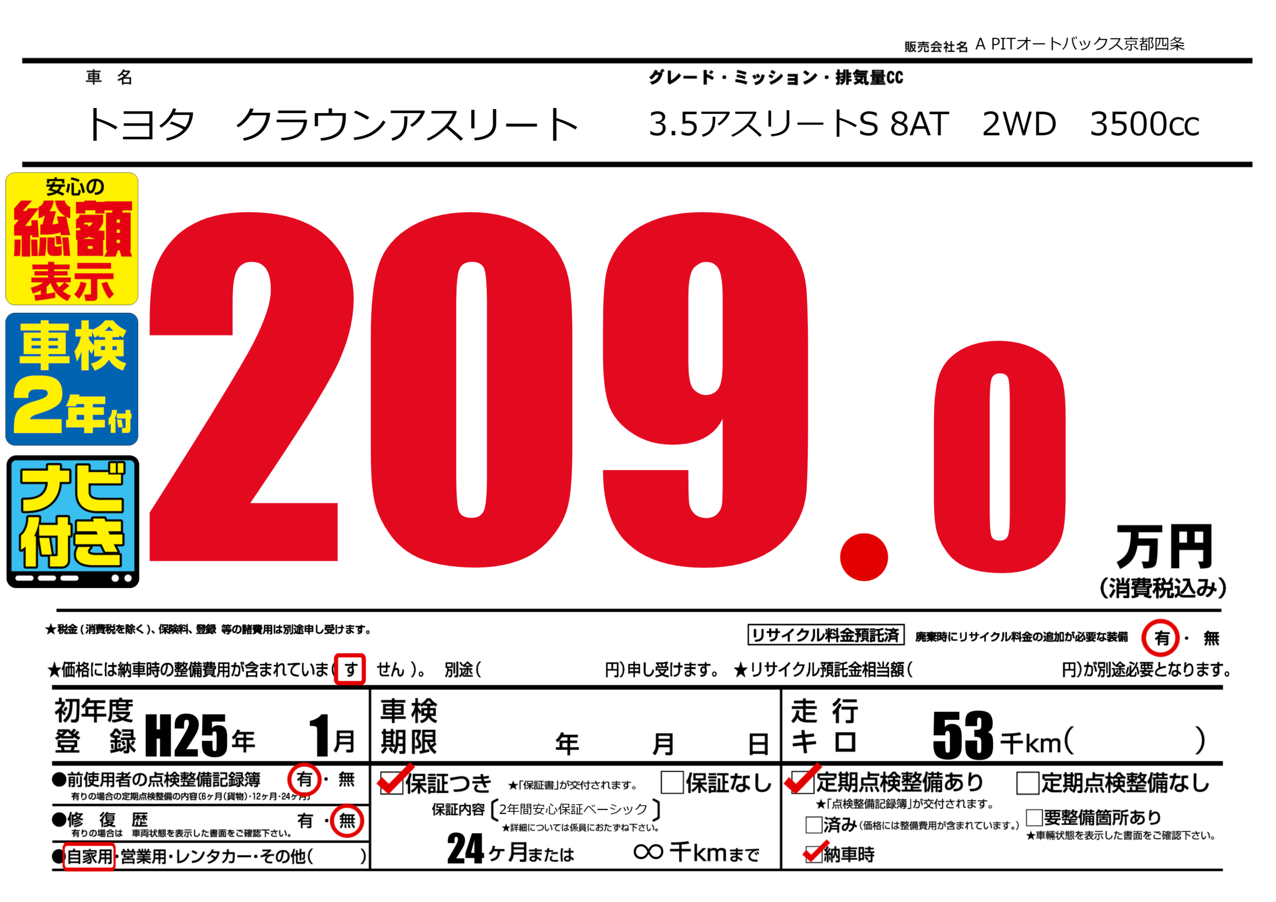 | 車名 | トヨタ クラウンアスリート | グレード ミッション 排気量 |
