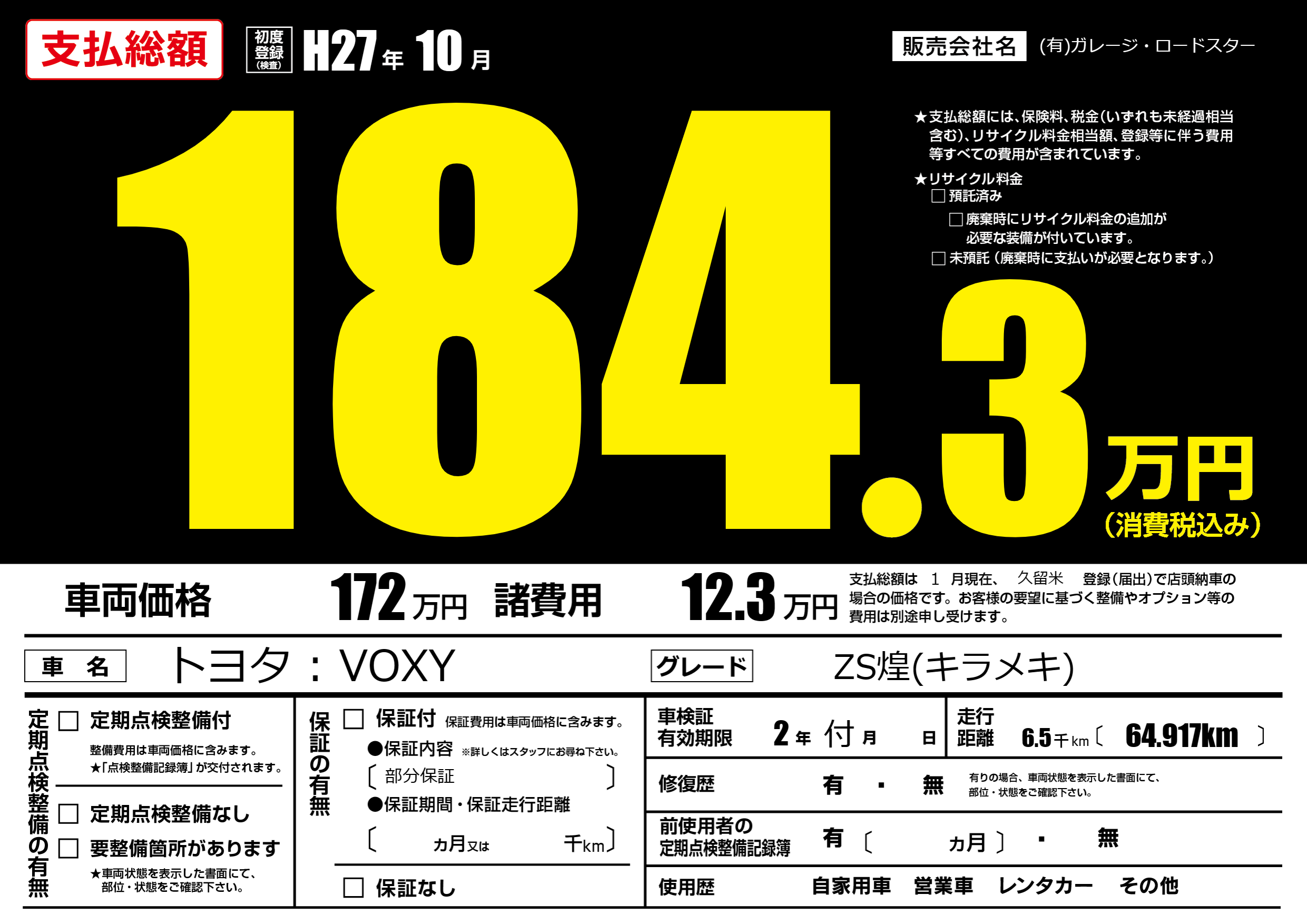 | 車名 | トヨタ : VOXY | グレード ミッション 排気量 |