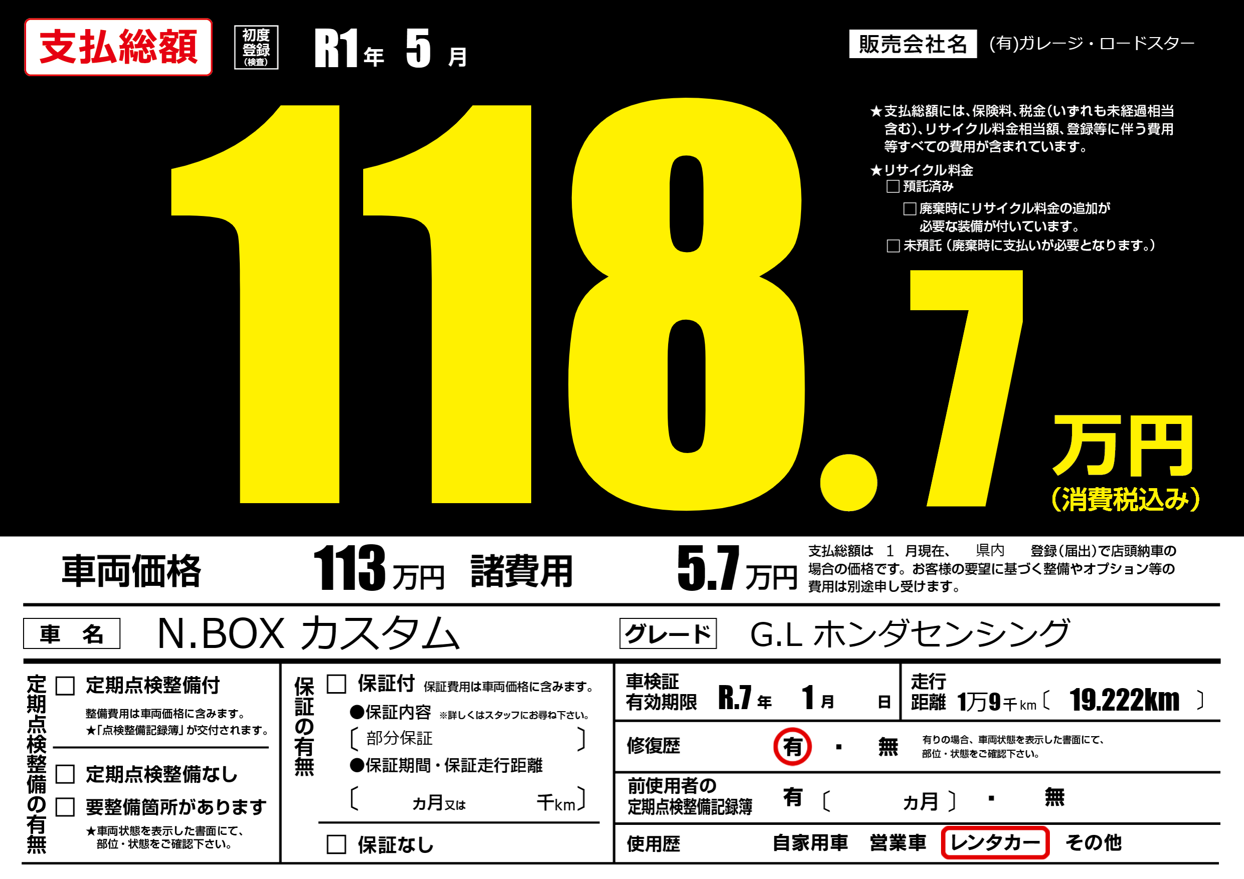 | 走行キロ | 0.1万km | 初年度登録 | R1年5月 |