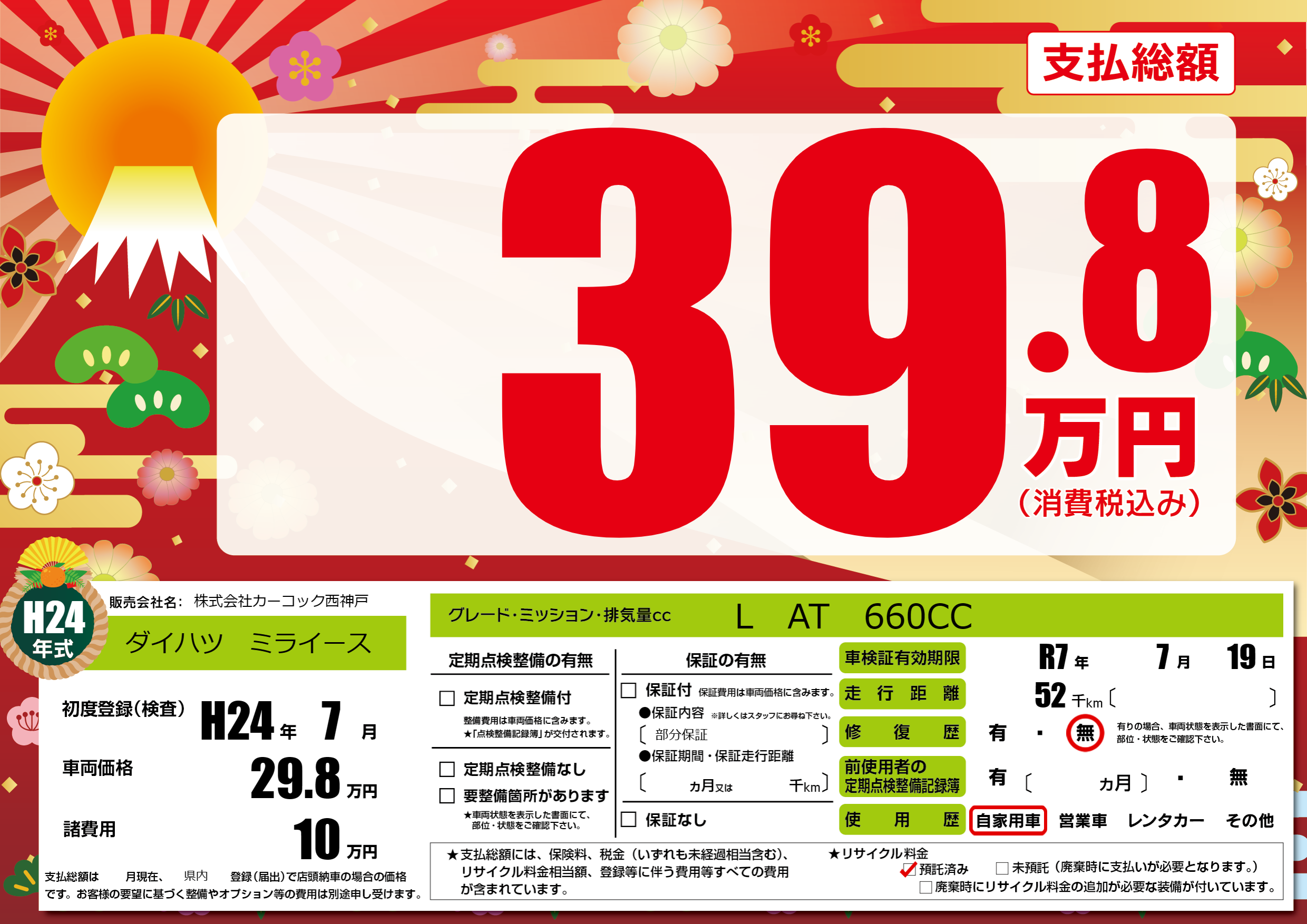 | 走行キロ | 5.2万km | 初年度登録 | H24年7月 |