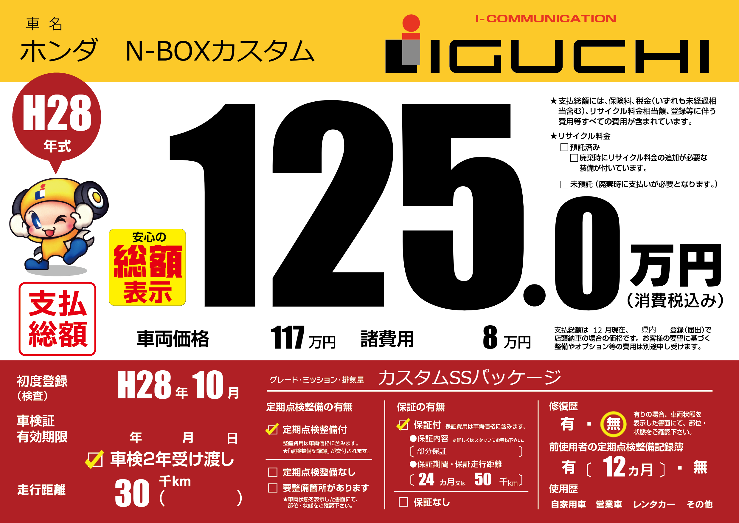 | 走行キロ | 3万km | 初年度登録 | H28年10月 |