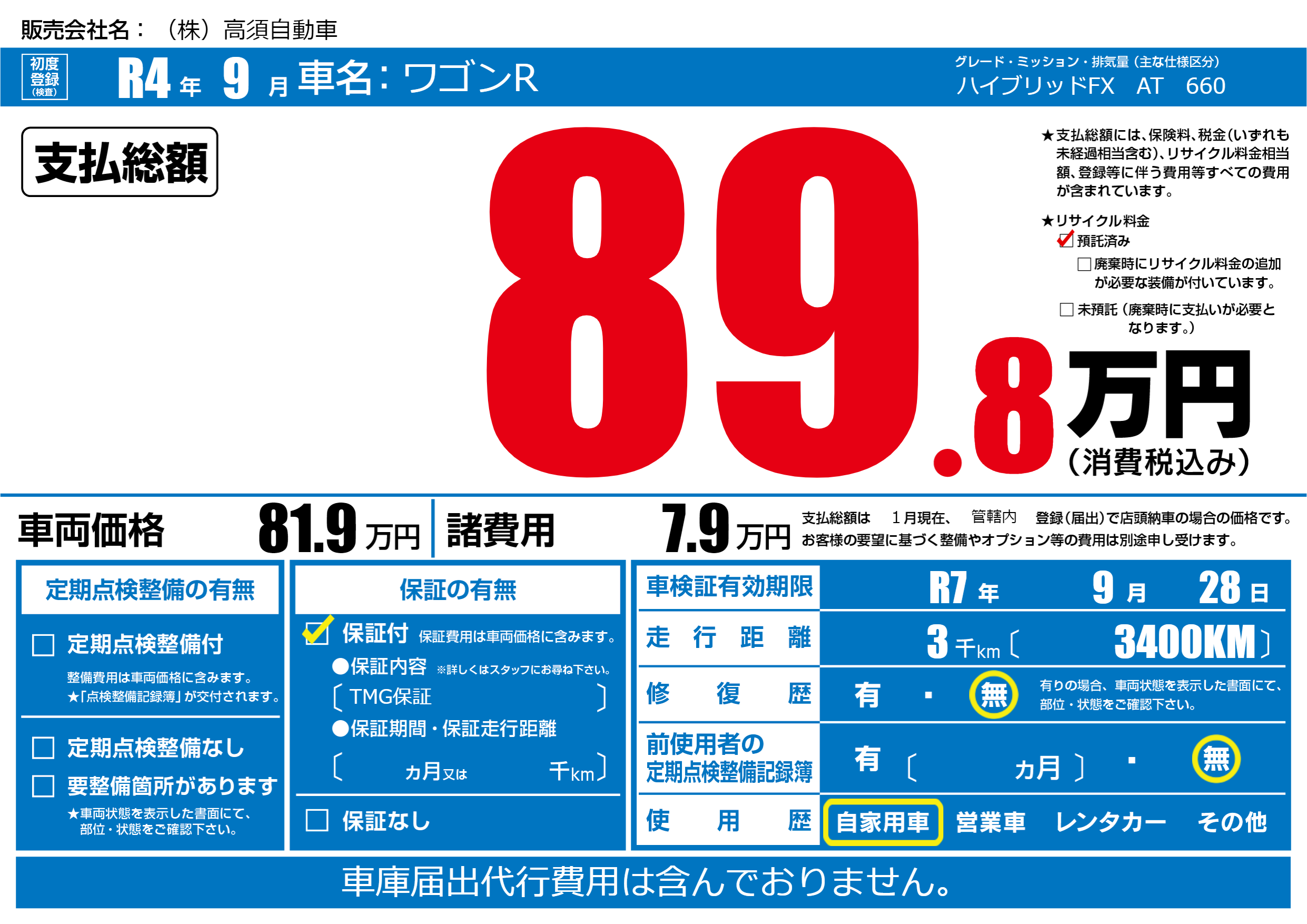 | 車名 | ワゴンR | グレード ミッション 排気量 |