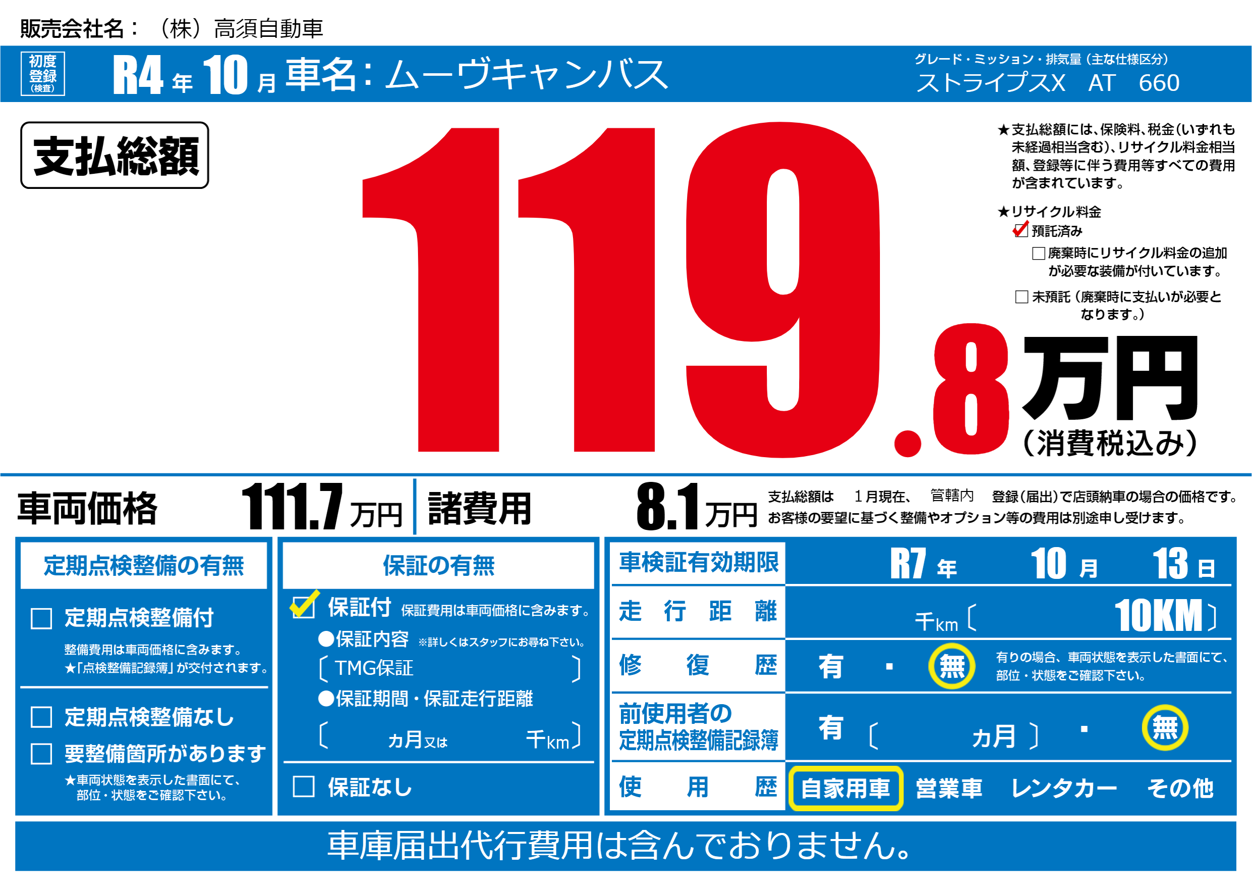 | 走行キロ | - | 初年度登録 | R4年10月 |