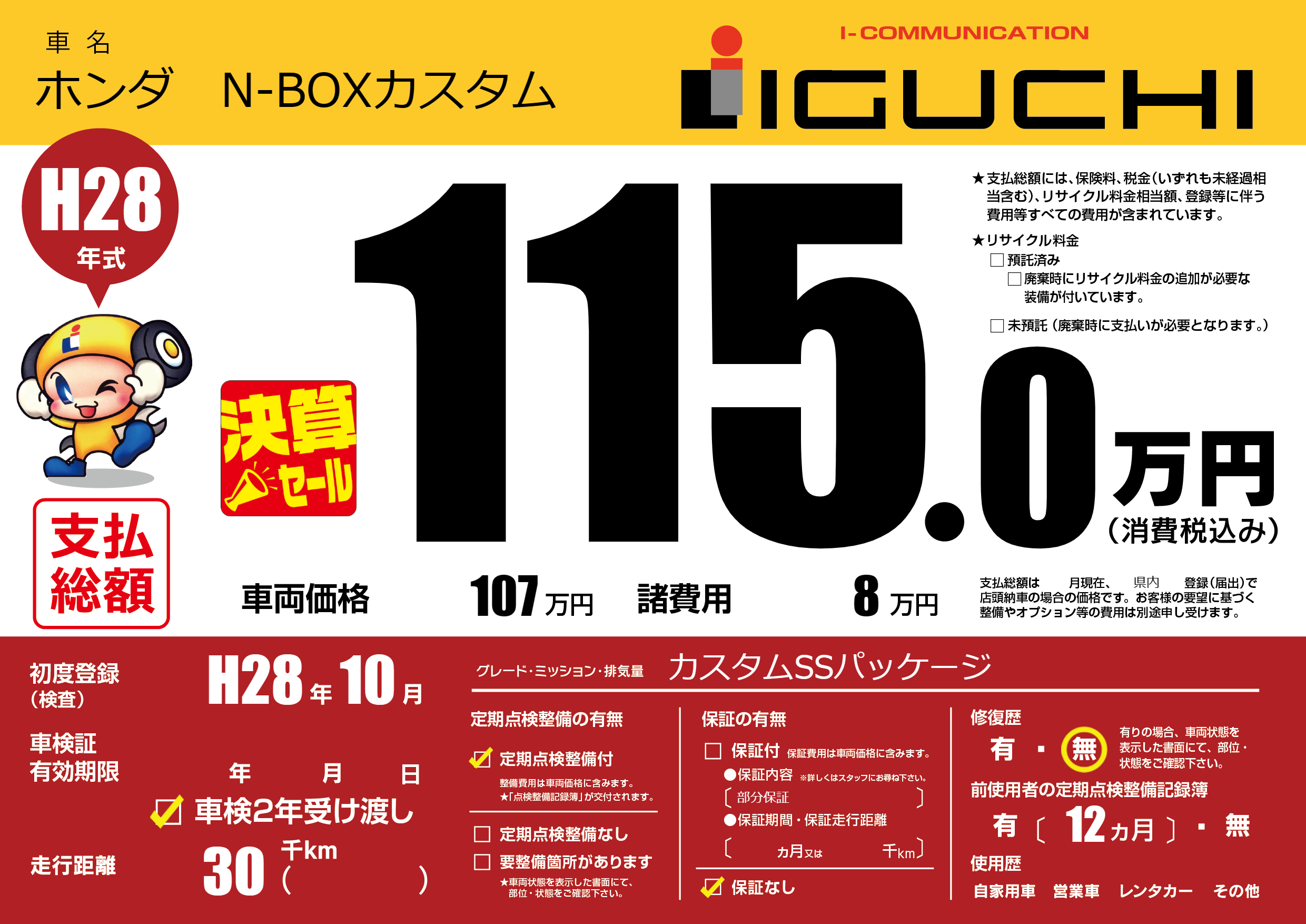 | 走行キロ | 3万km | 初年度登録 | H28年10月 |
