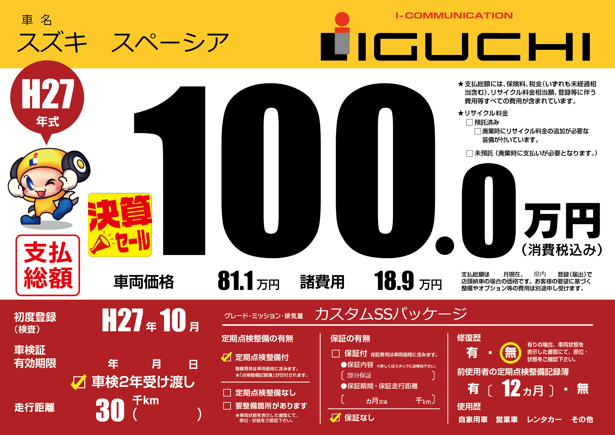 | 走行キロ | 3万km | 初年度登録 | H27年10月 |