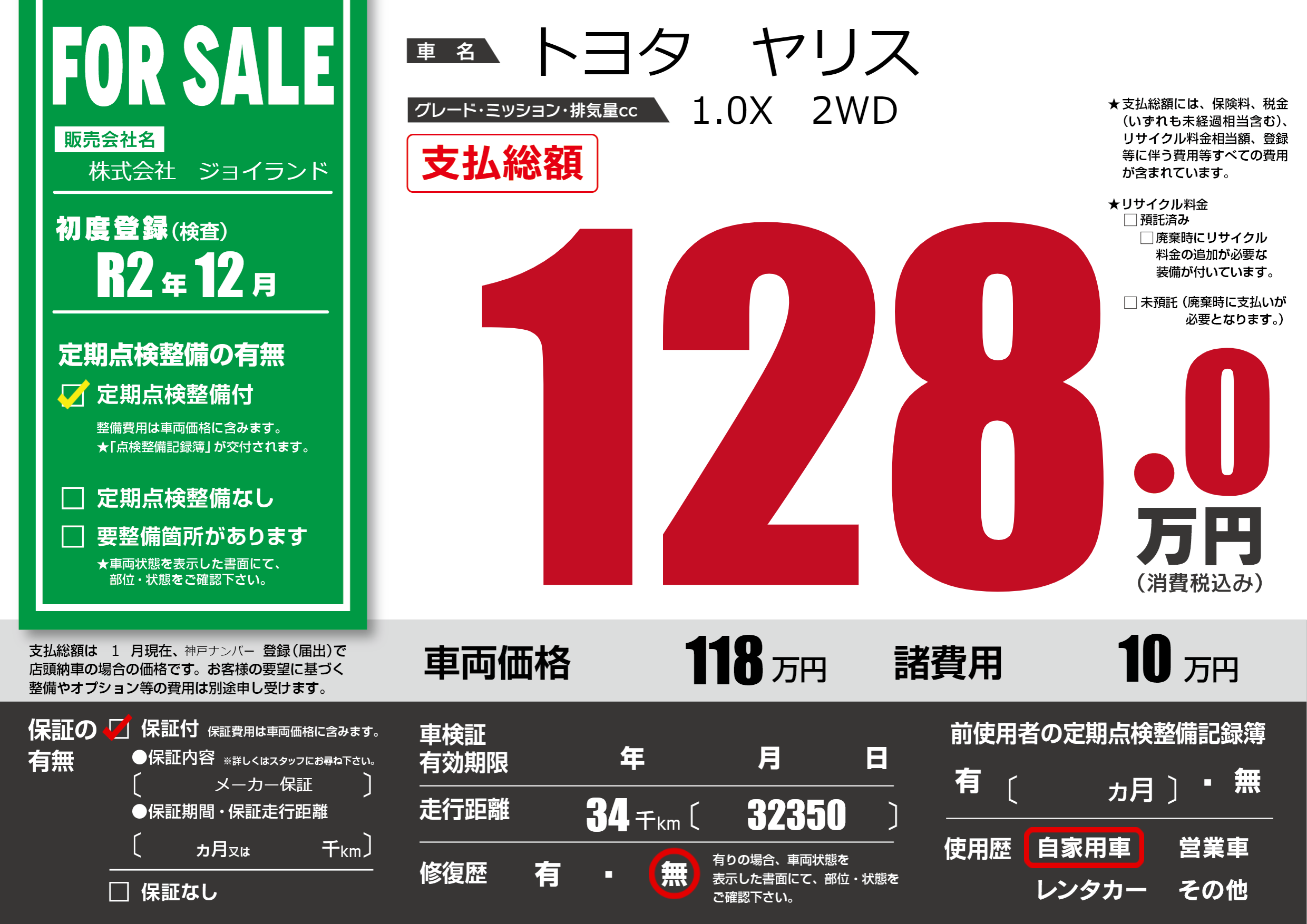 保証付き 保証内容( メーカー保証) ---ヶ月または()千kmまで |