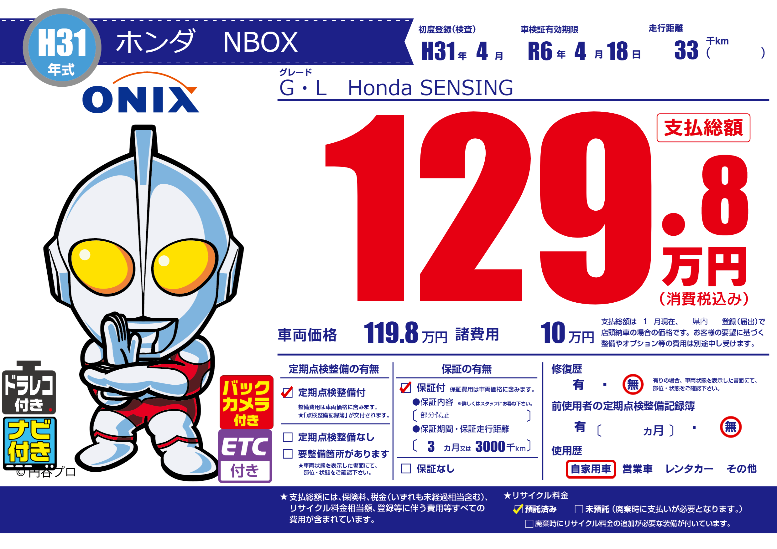 | 走行キロ | 3.3万km | 初年度登録 | H31年4月 |