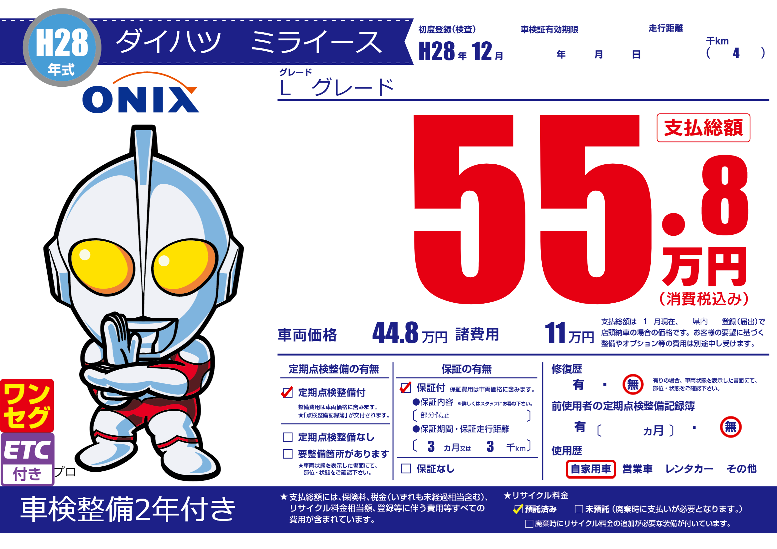| 走行キロ | - | 初年度登録 | H28年12月 |
