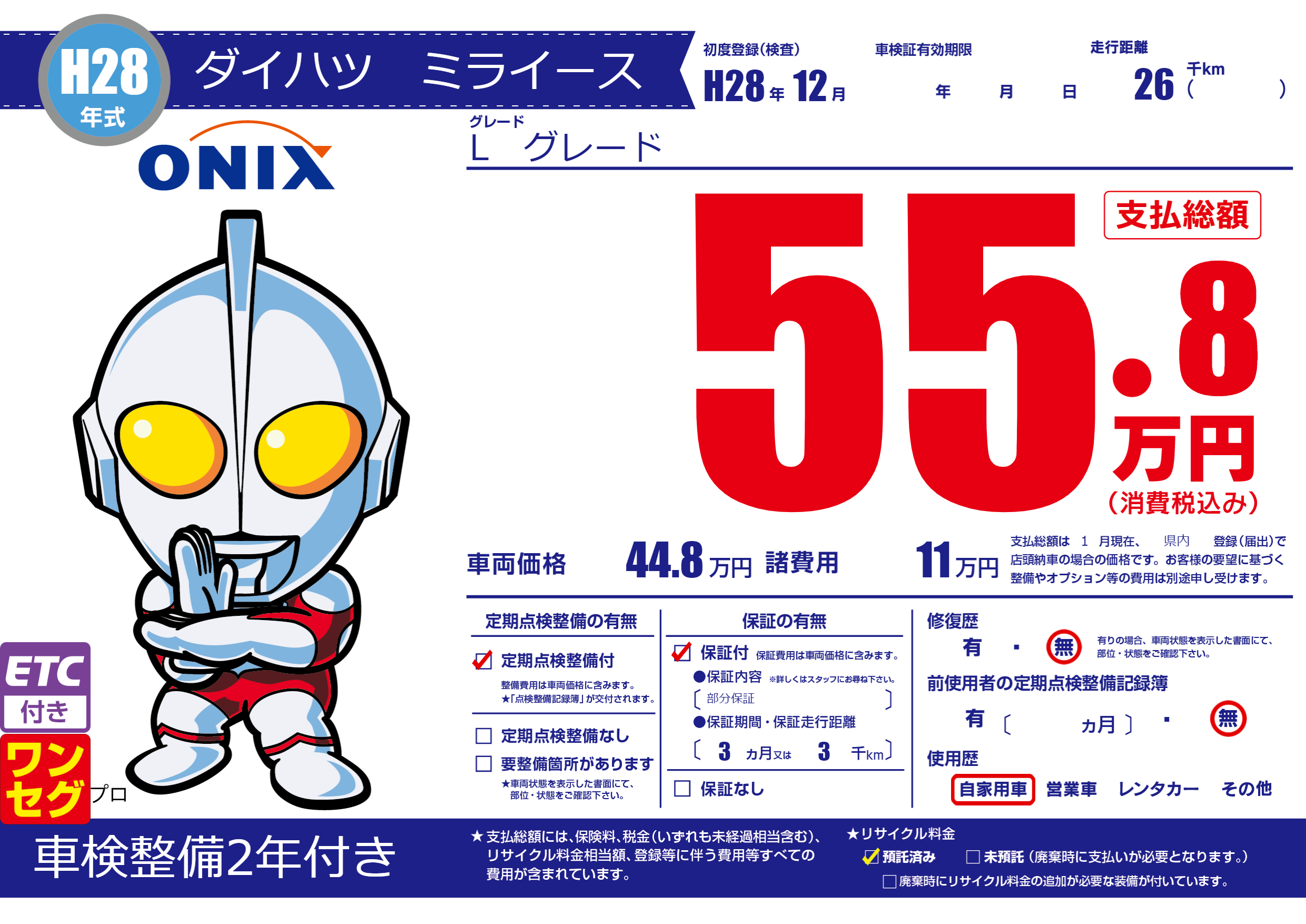 | 走行キロ | 2.6万km | 初年度登録 | H28年12月 |