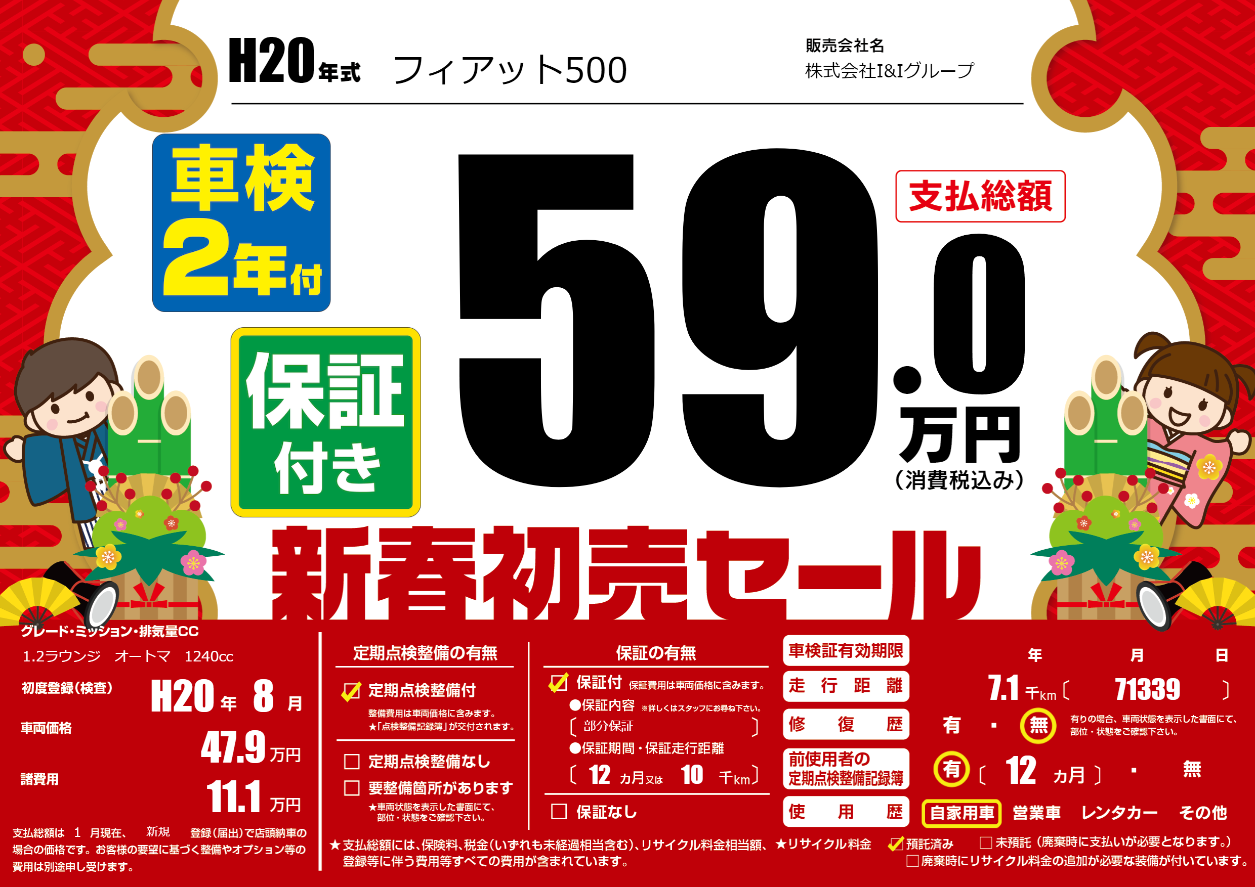 | 車名 | フィアット500 | グレード ミッション 排気量 |