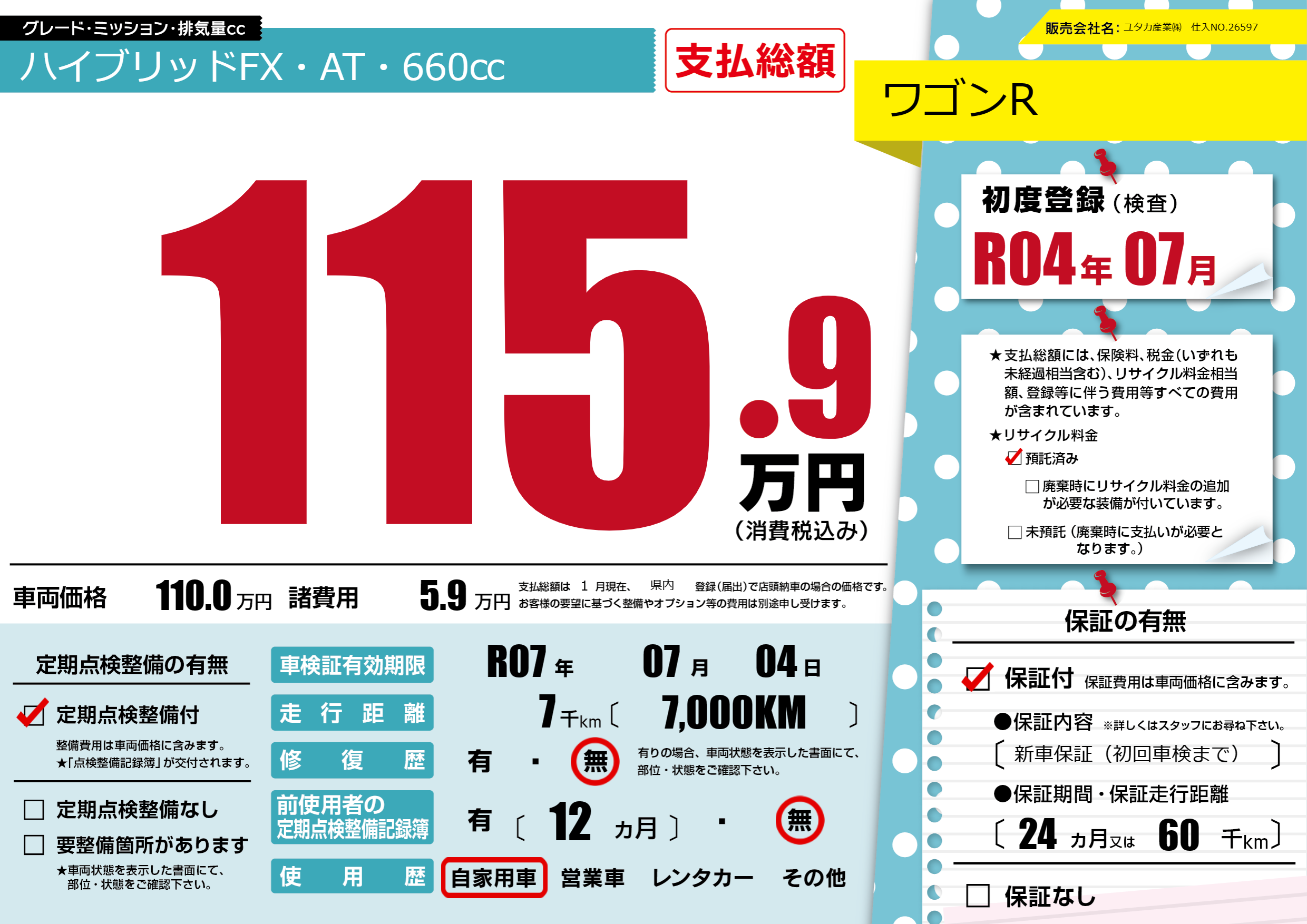 | 走行キロ | 0.7万km | 初年度登録 | R04年07月 |