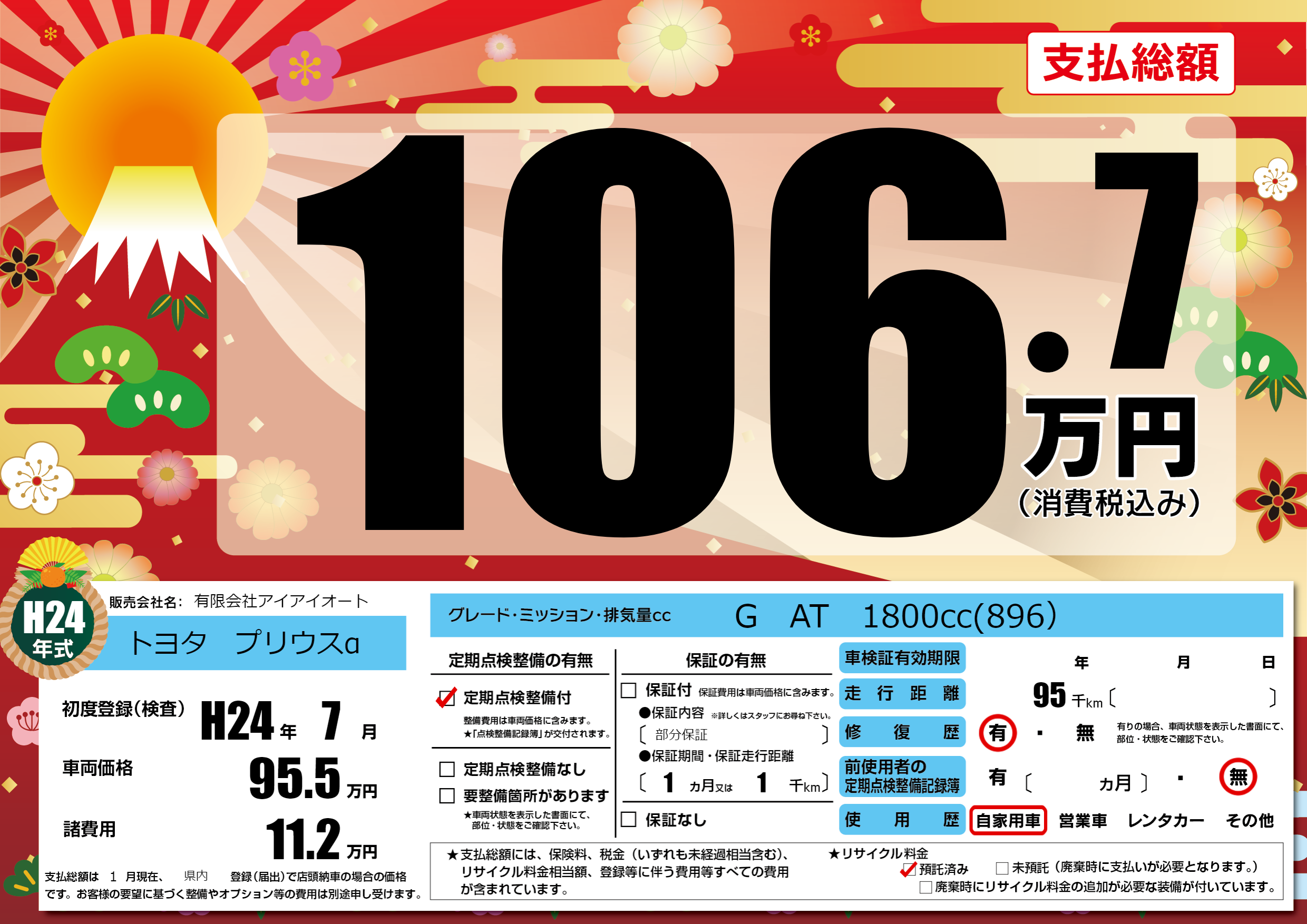 | 車名 | トヨタ プリウスα | グレード ミッション 排気量 |