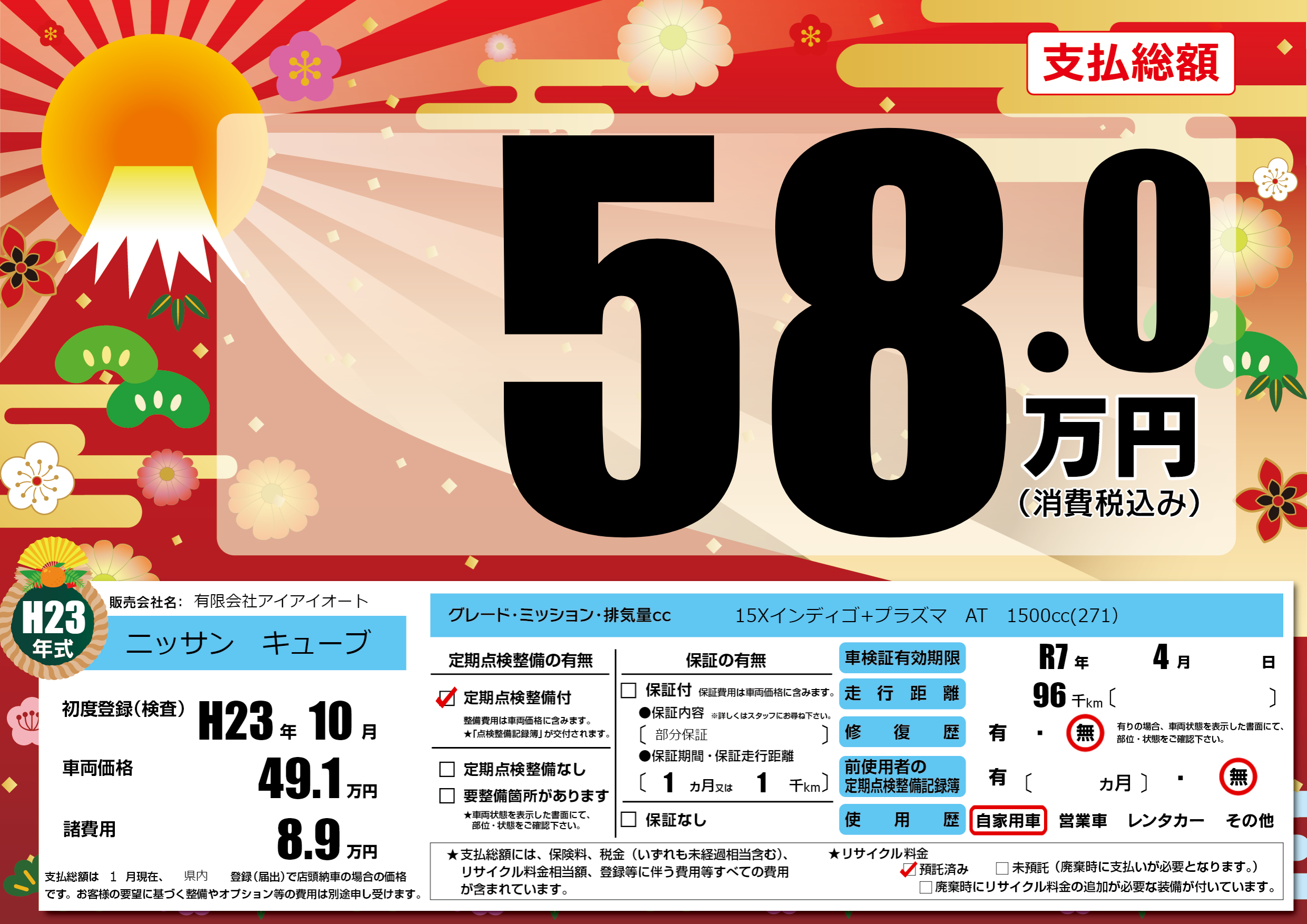 | 走行キロ | 9.6万km | 初年度登録 | H23年10月 |