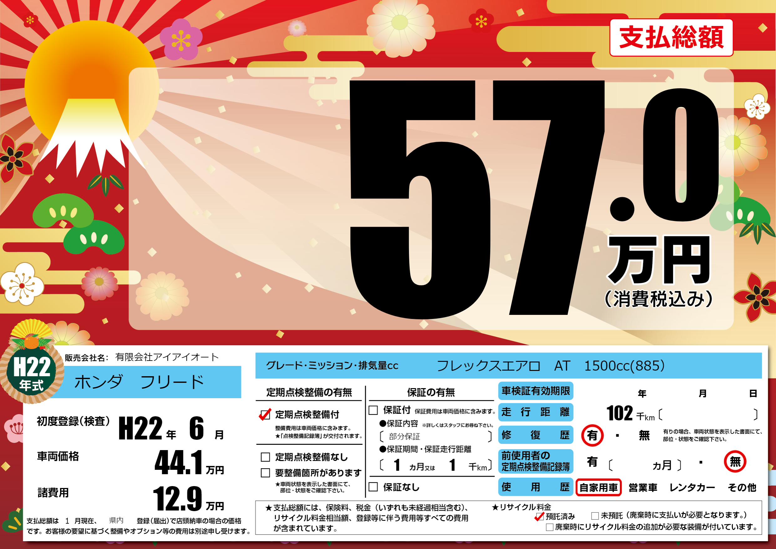 | 走行キロ | 10.2万km | 初年度登録 | H22年6月 |