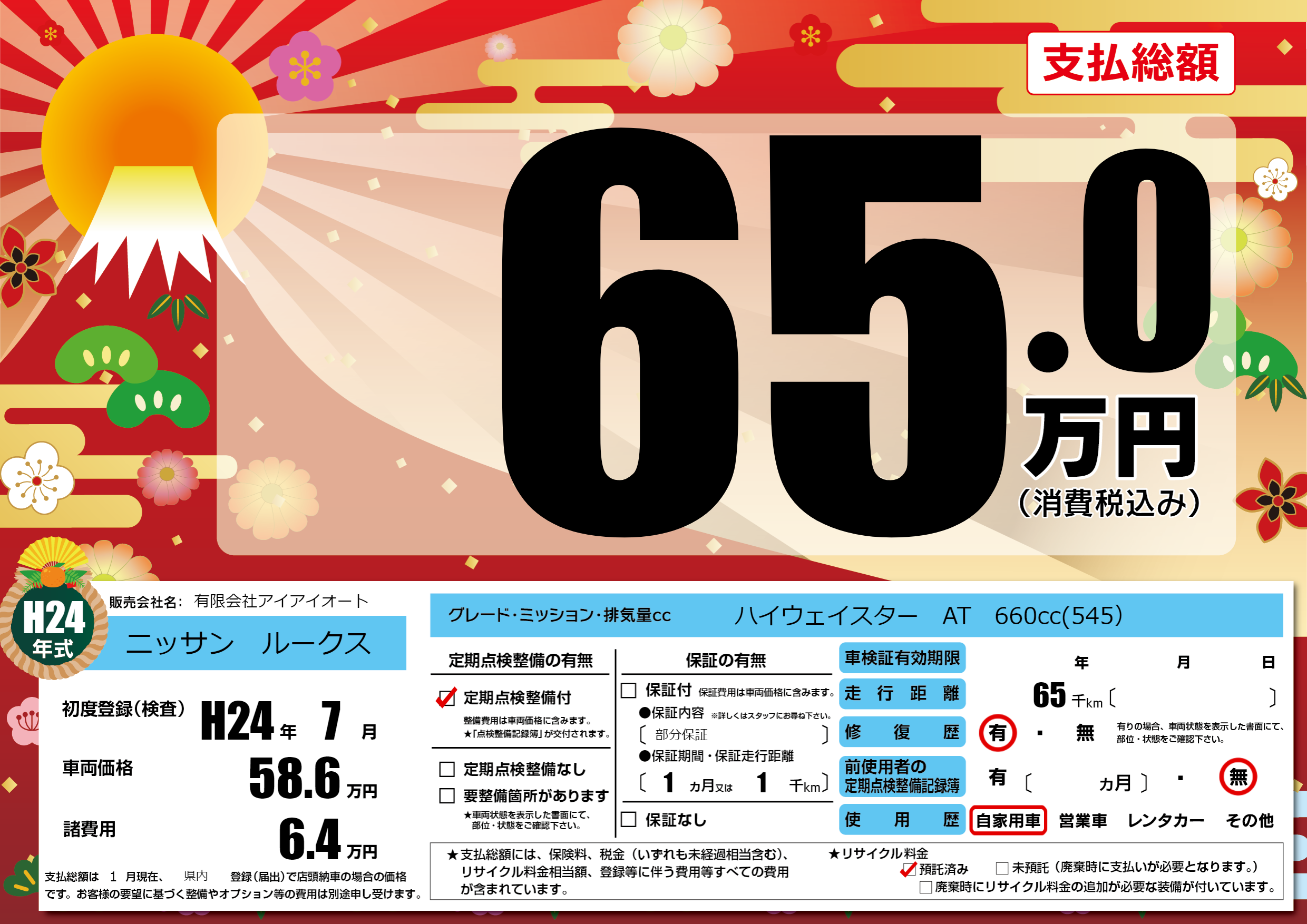 | 走行キロ | 6.5万km | 初年度登録 | H24年7月 |