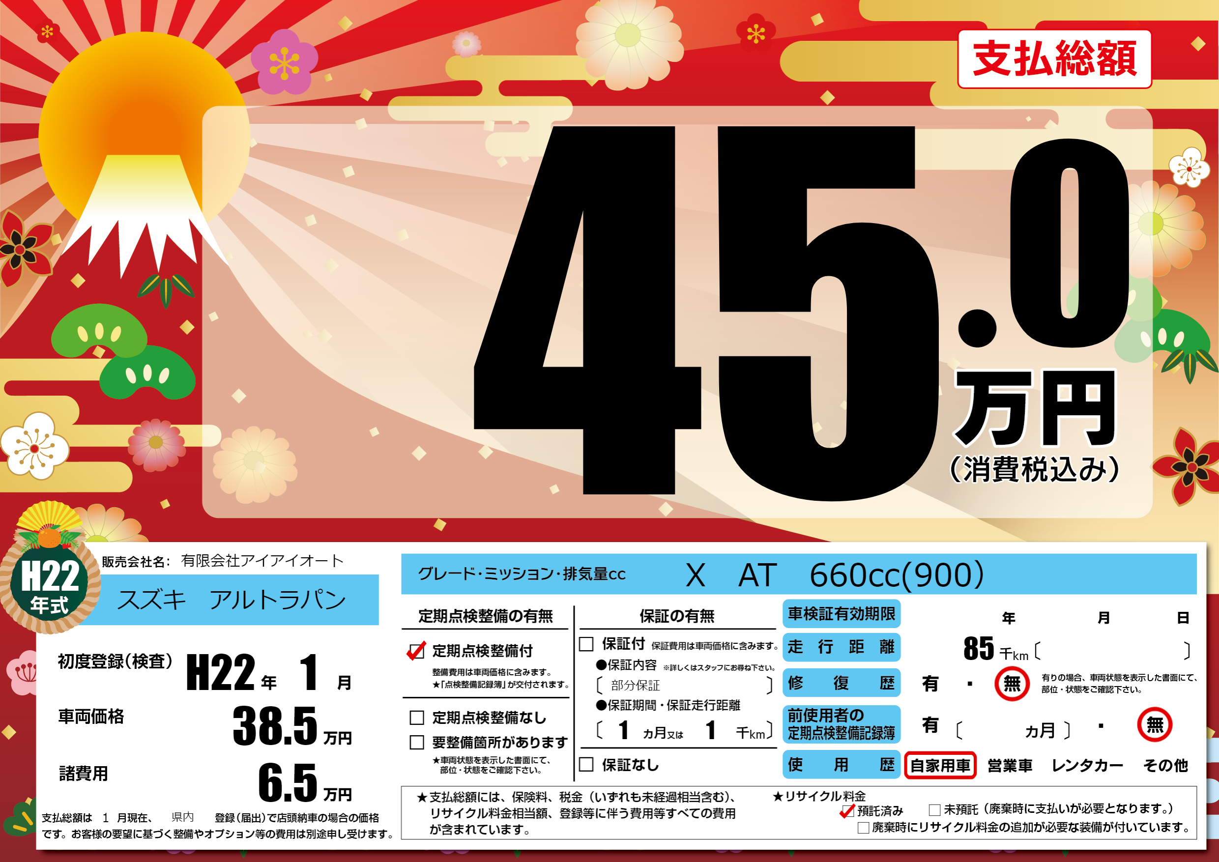 | 走行キロ | 8.5万km | 初年度登録 | H22年1月 |