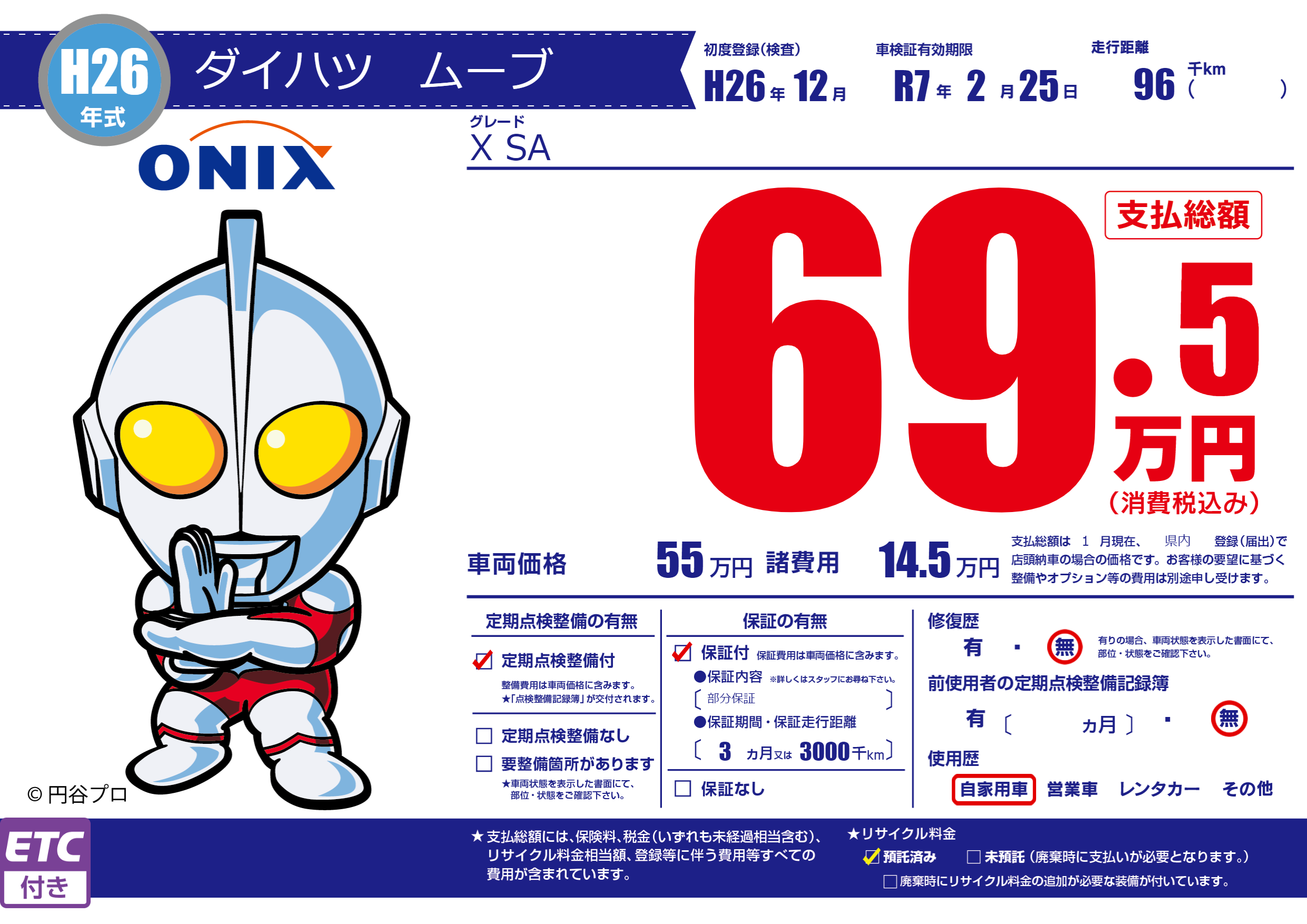 | 走行キロ | 9.6万km | 初年度登録 | H26年12月 |