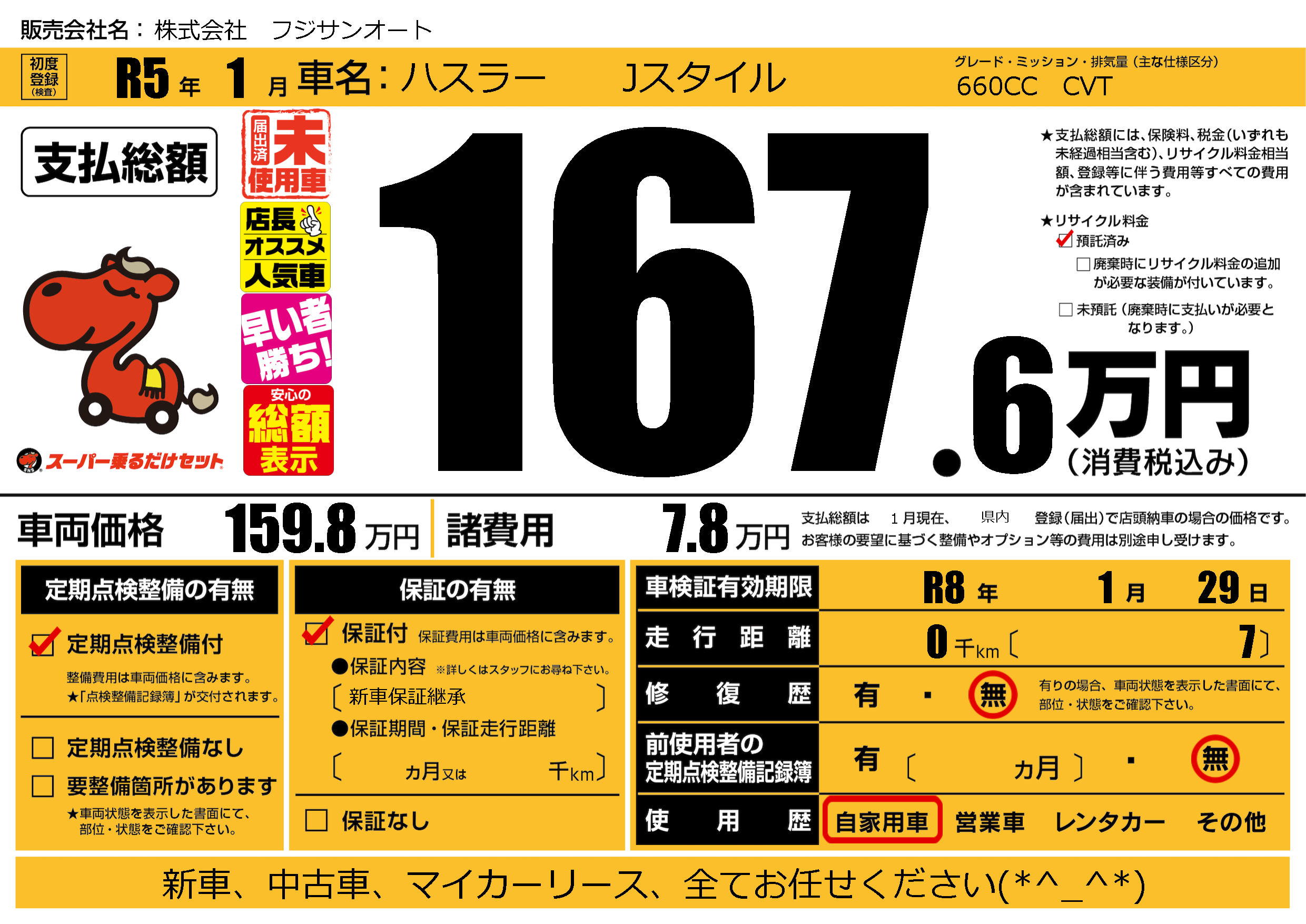 | 車名 | ハスラー Jスタイル | グレード ミッション 排気量 |