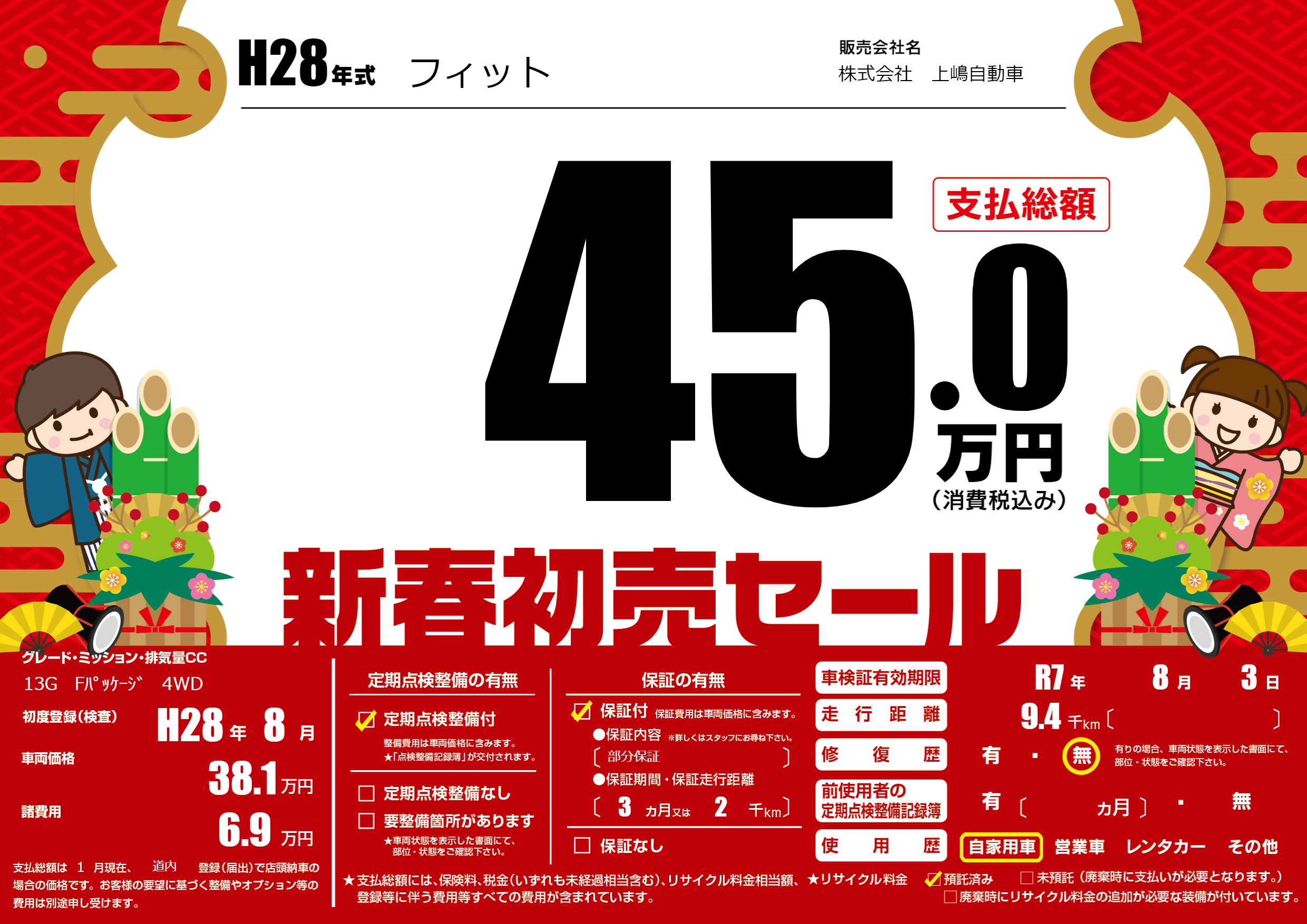 | 走行キロ | 0.9万km | 初年度登録 | H28年8月 |