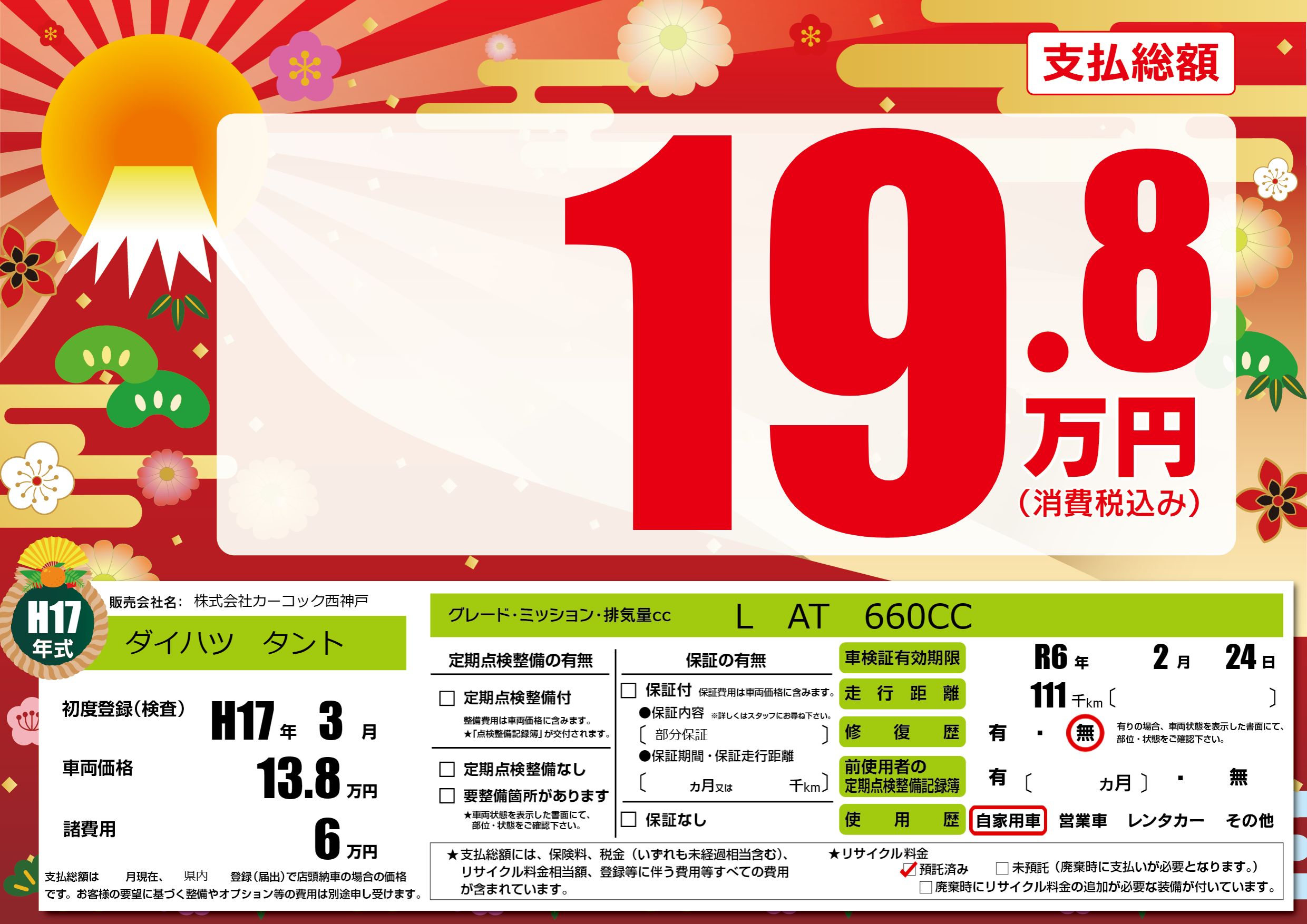 | 車名 | ダイハツ タント | グレード ミッション 排気量 |