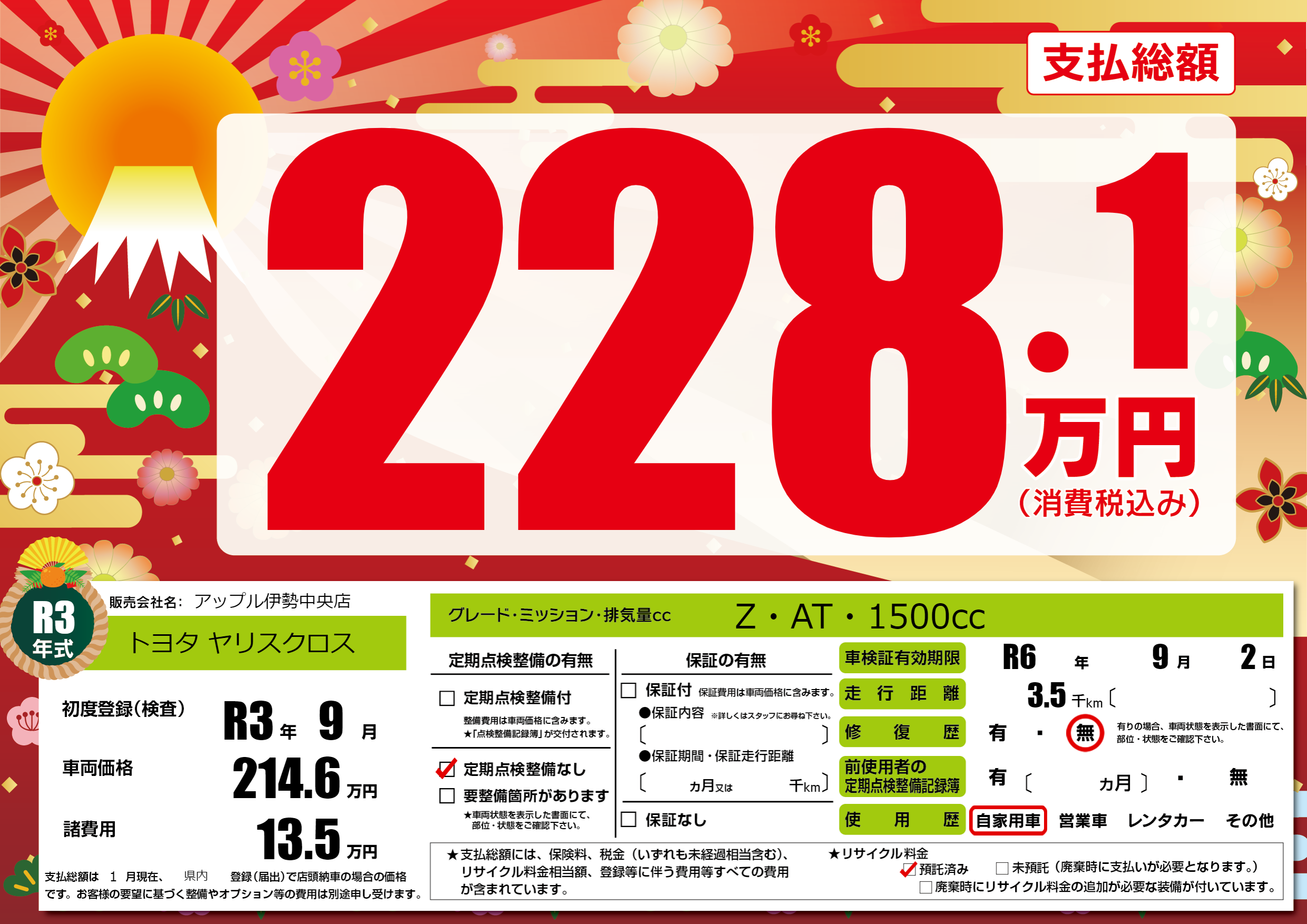 | 走行キロ | 0.3万km | 初年度登録 | R3年9月 |